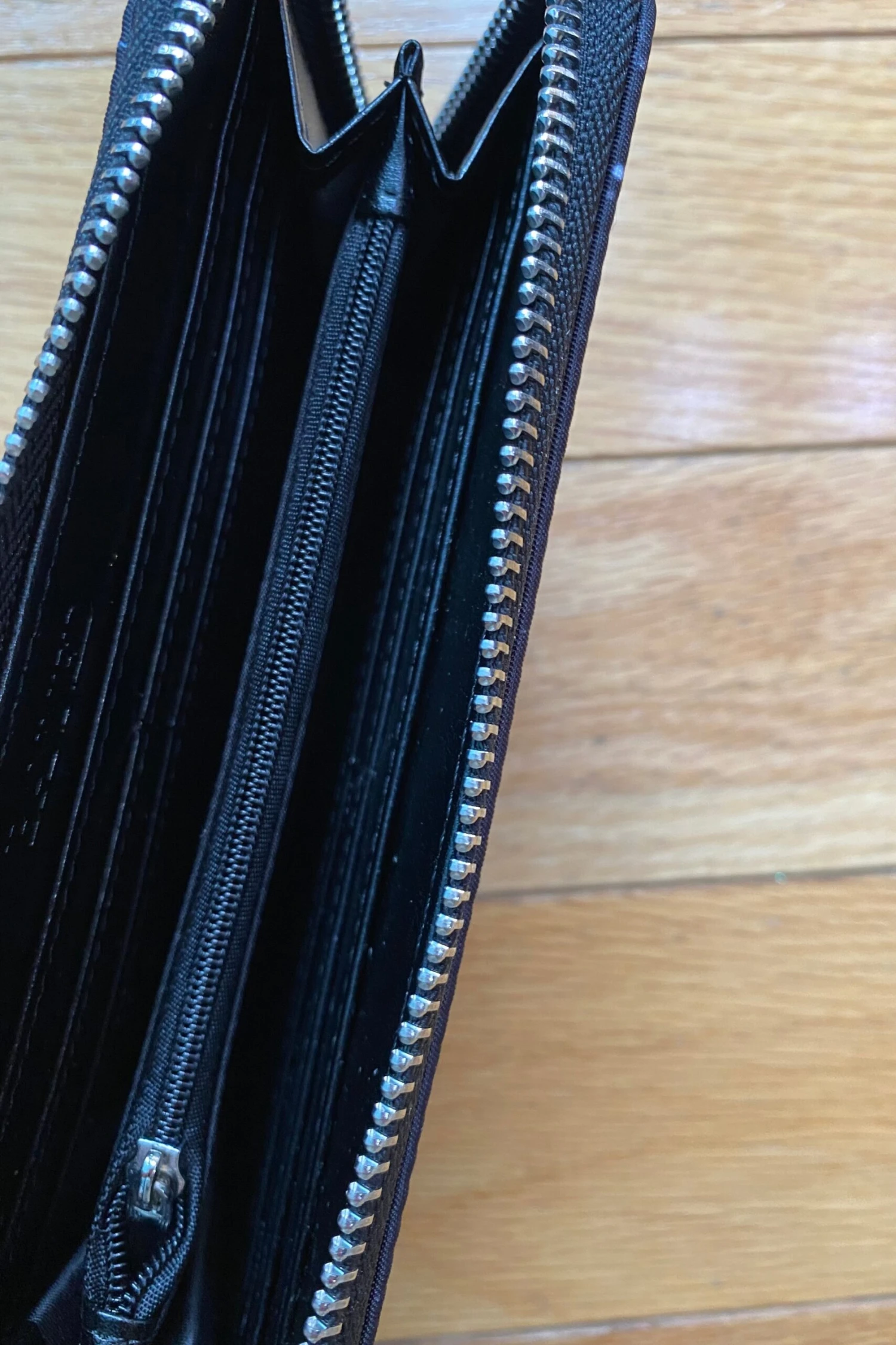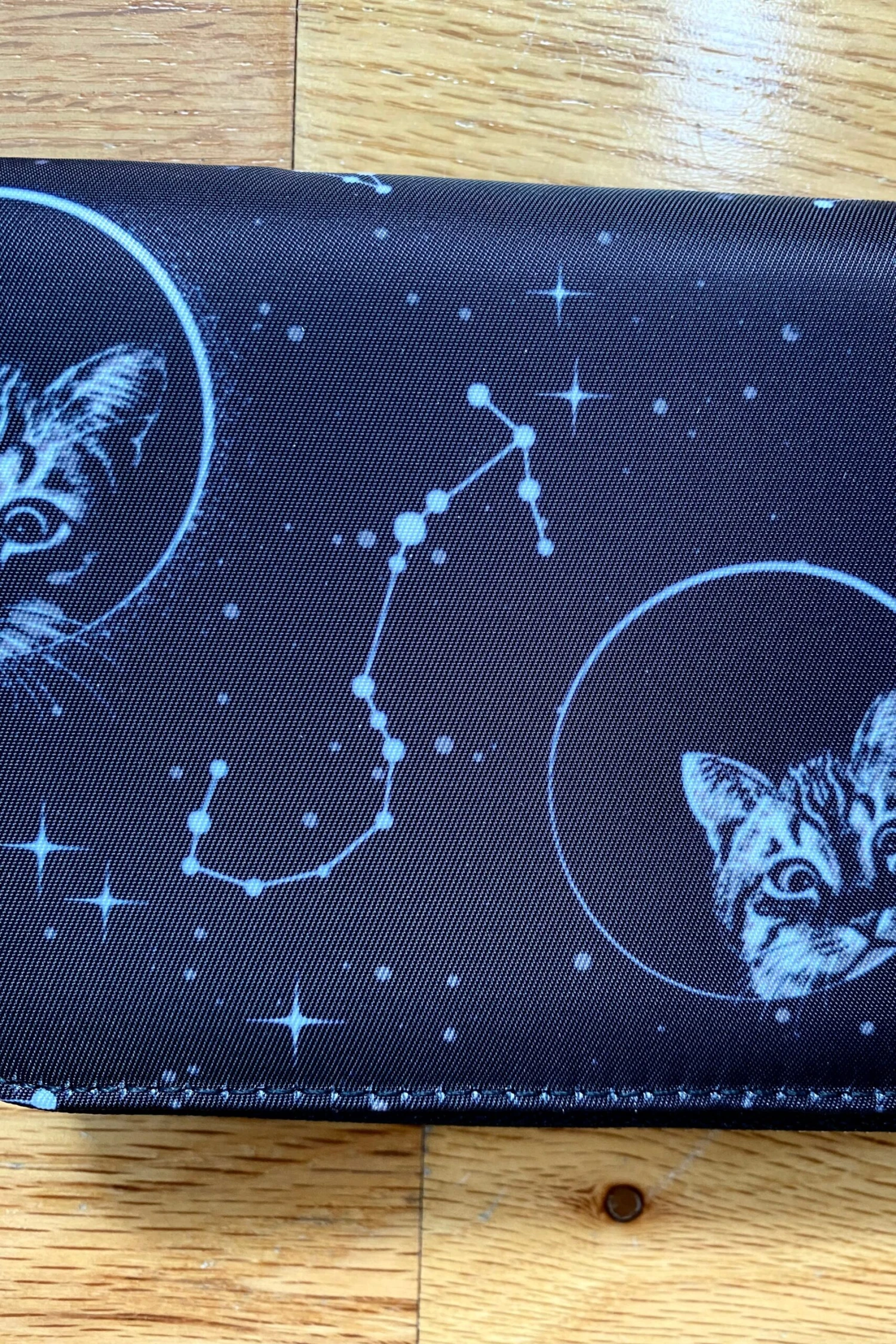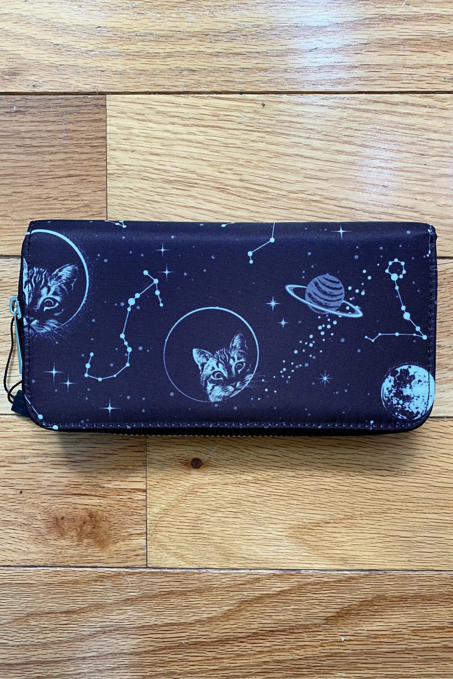 Black wallet with floating cat heads, constellations, the moon and stars. There is one big zip that opens to card slots and a zipper coin area.