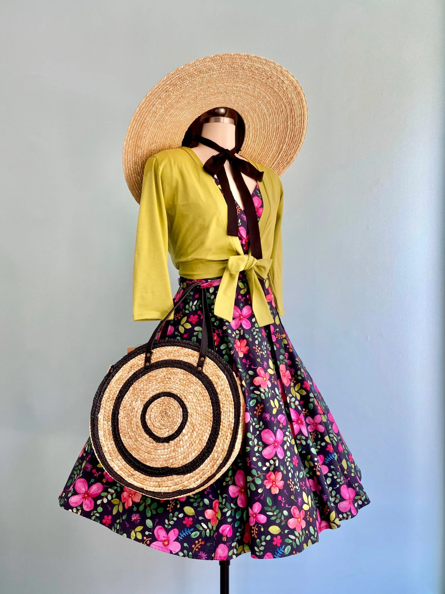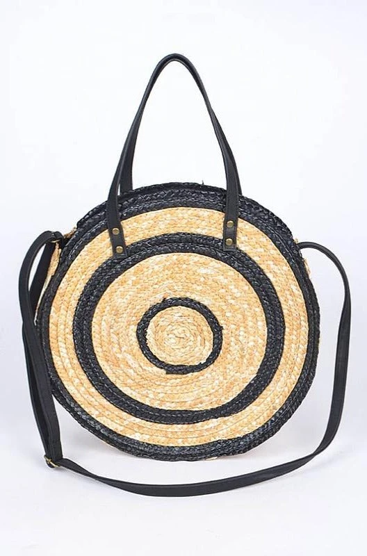 Straw bag in natural straw and black. Has tote handles and comes with an adjustable and removable cross-body strap. This bag does not have a closure, it is an open tote. Perfect for a day around the town or a quick picnic or beach trip! Lined in black cloth.