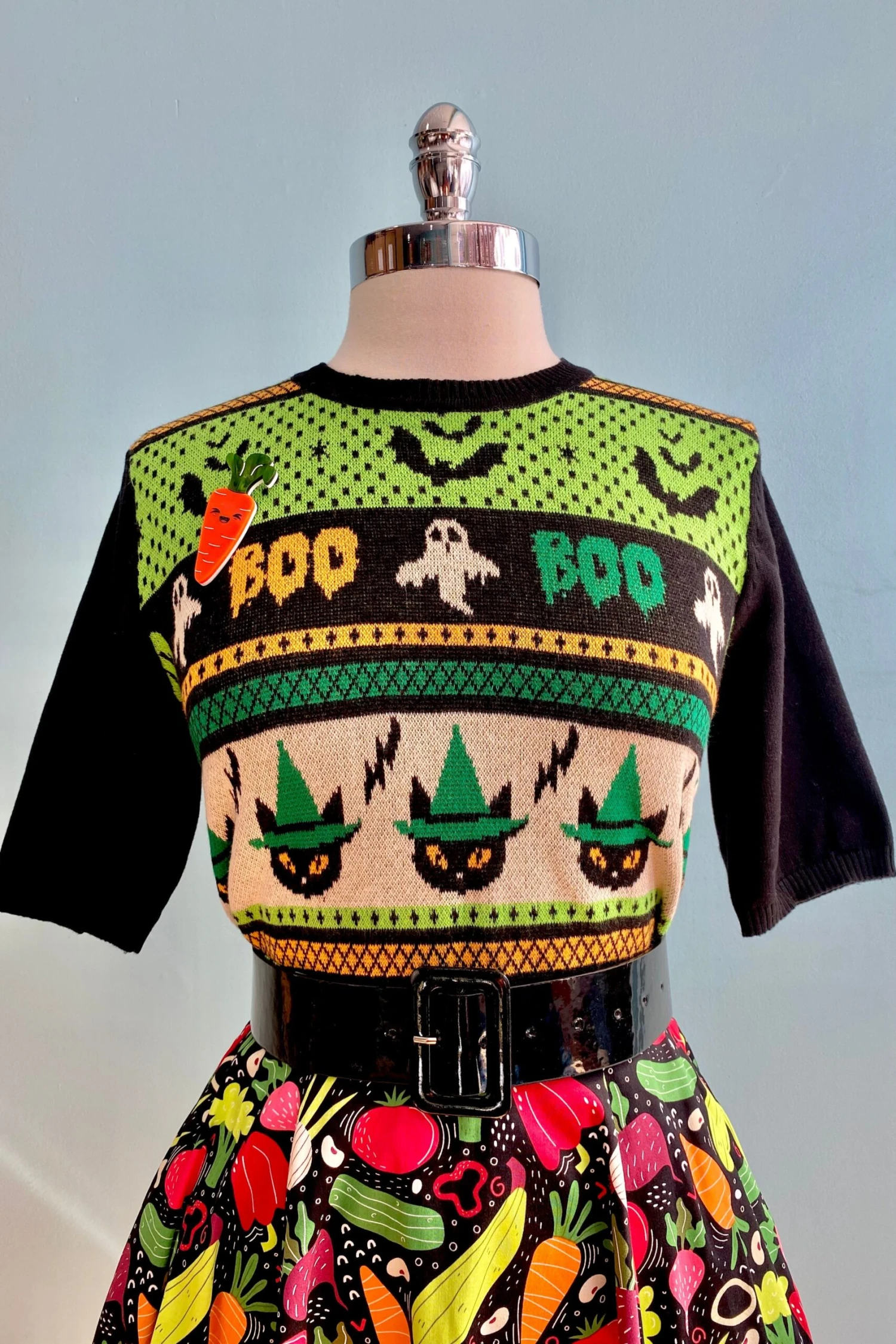 Pullover short sleeve sweater inspired by a fair isle pattern. In the knit you will see cats in witch hats, bats and ghosts. The body is green, black and orange and the sleeves are black.