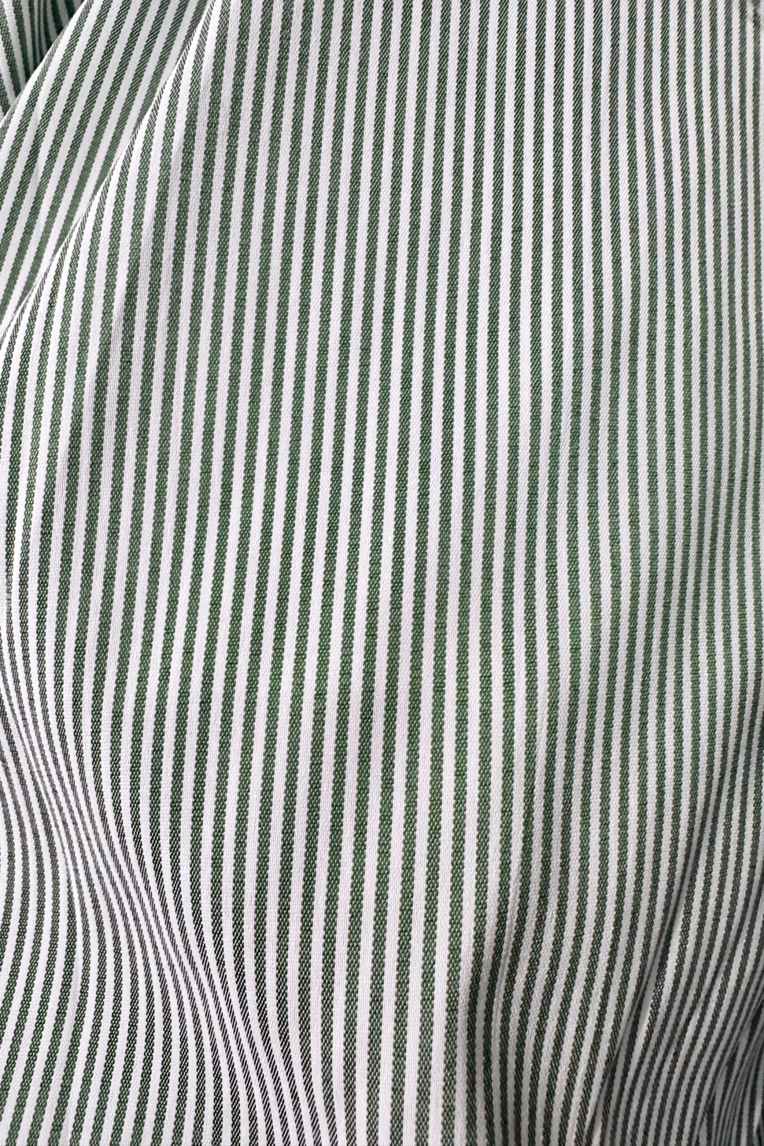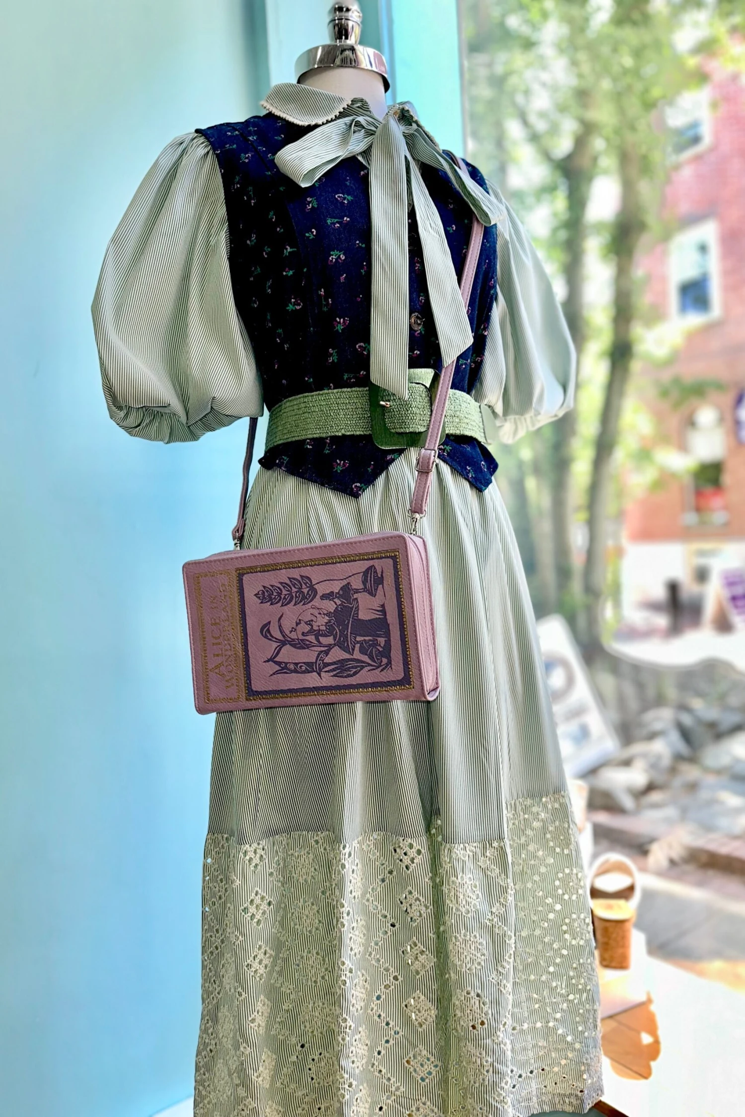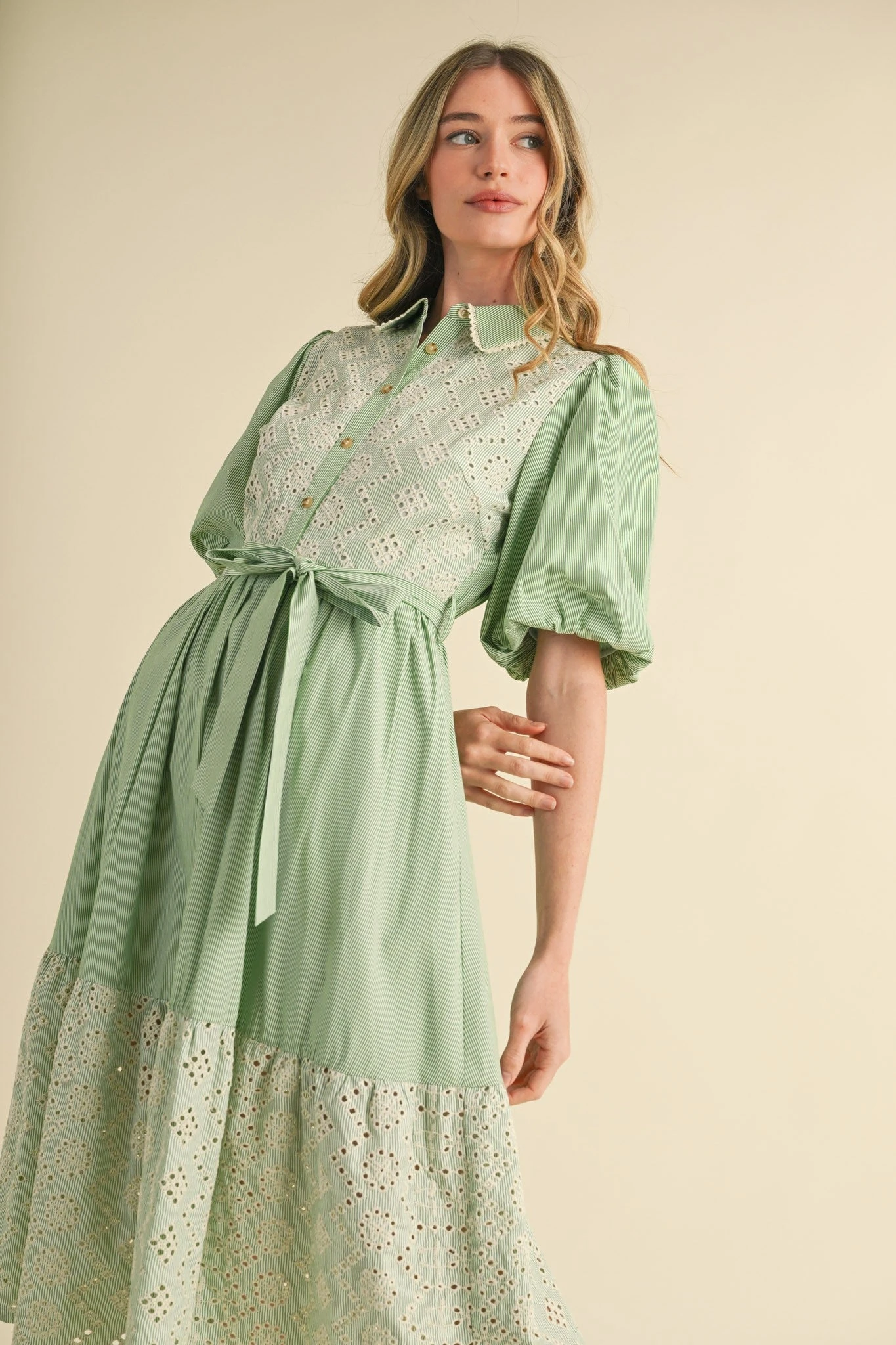 Green and white stripes dress with an eyelet front bodice and skirt hem. This dress has a summary front and a trimmed fold over collar. The skirt has an elastic back waist, self sash and is full with side pockets. The balloon sleeves are about elbow length and have gathering at the shoulder. This dress is fully lined.
