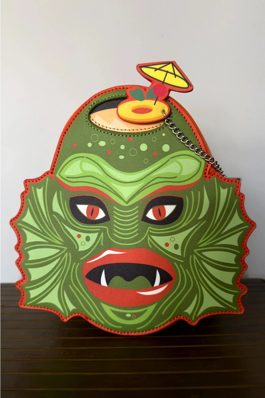 This fun bag features original artwork from the Oblong Box Shop of the monster from the black lagoon as a fun tropical tiki drink on the front in green with orange details. There is an adjustable strap that can be worn short, long or as a backpack and a fun removable charm of a tropical pineapple slice with an umbrella! Made of PU faux leather. With a zipper closure and 3 pockets on the inside. This bag is big enough to fit all your tiki essentials!