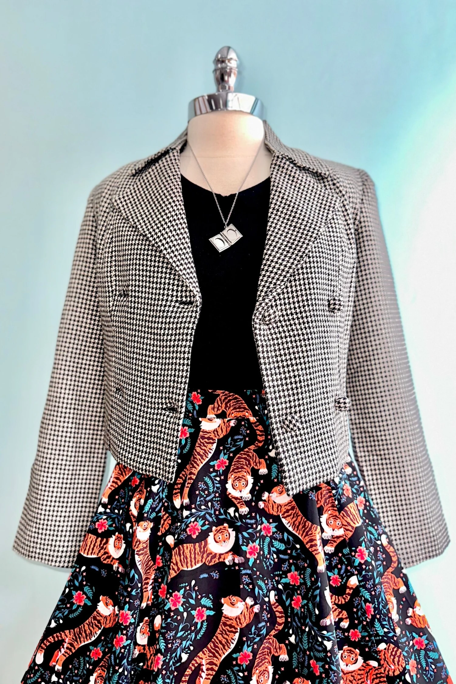 Black short sleeve sweater with a scalloped fold over collar. This is a fine knit, great tucked in or worn out. The sleeves reach to about the elbow.