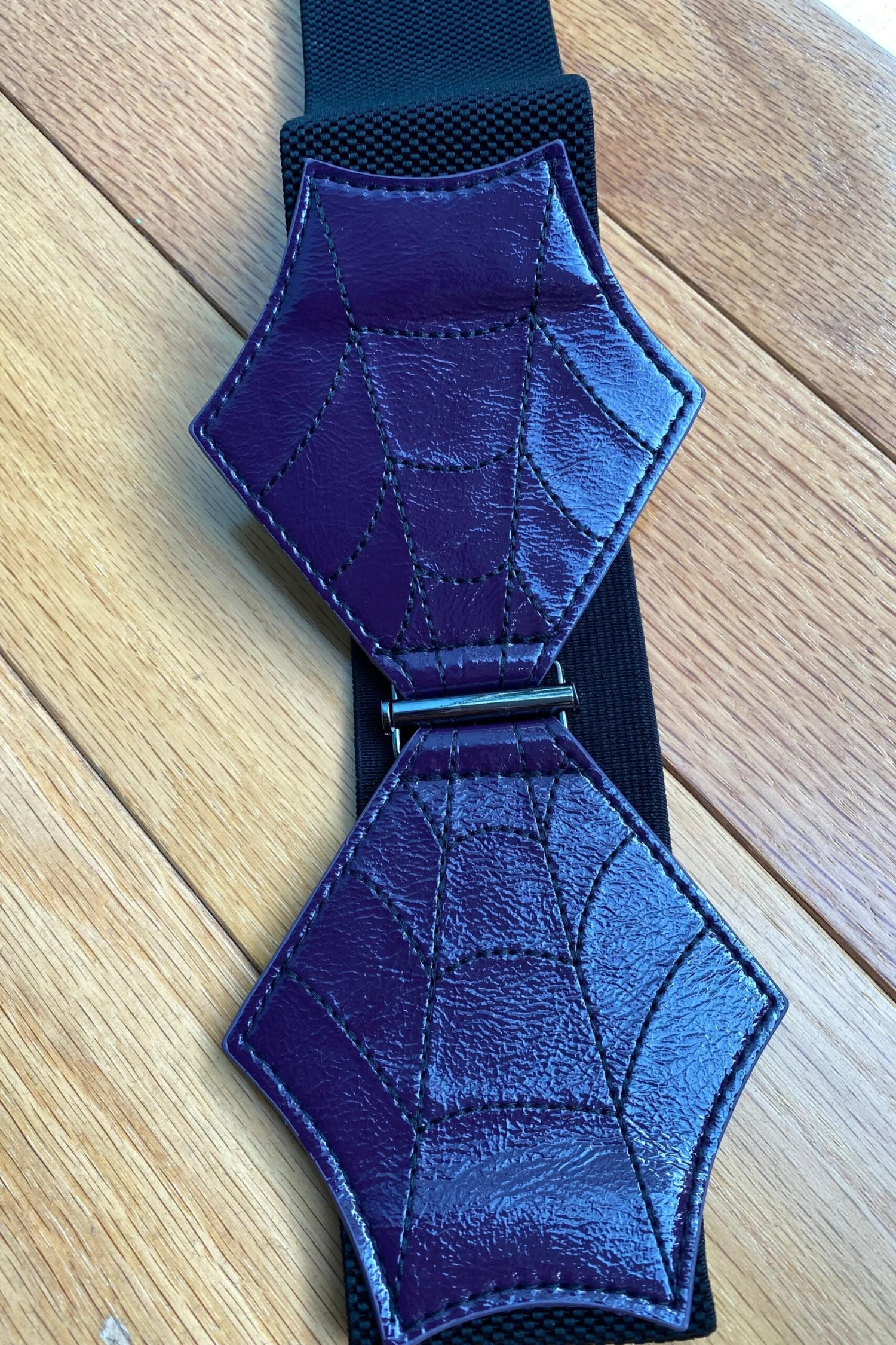 Purple patent leatherette belt of a spiderweb with an elastic cinch. The clasp is a metal slide. Measures 2.25″ at the elastic and the widest part of the spiderweb in almost 4″.