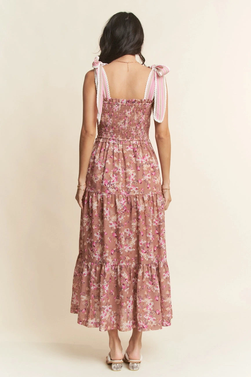 Tan dress with pink and orange roses in a midi length. This dress has a smocked bodice and striped tie shoulder straps. This dress is fully lined and has side pockets.