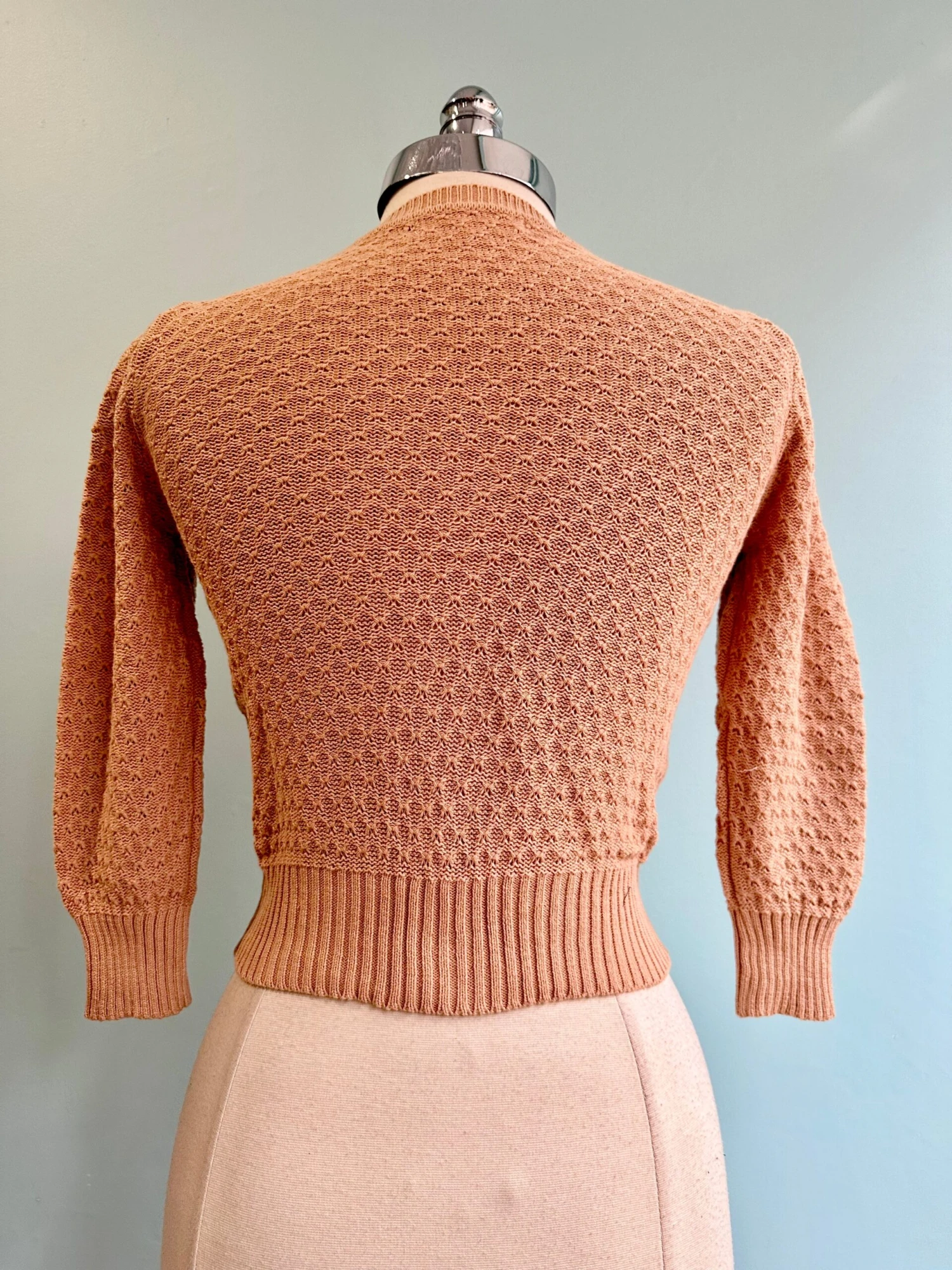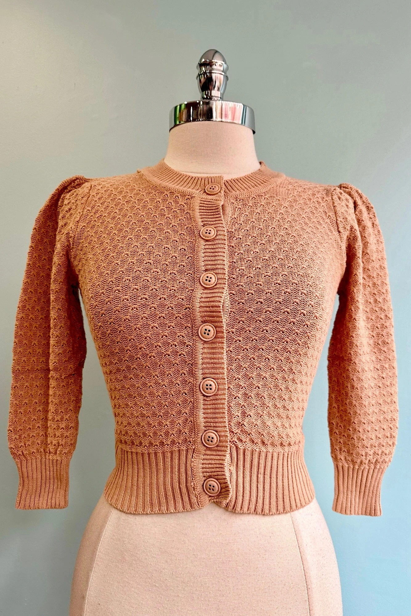 Tan 100% Cotton Knit Cardigan. This sweater is super cozy and a great alternative to the perfect cropped cardi! We like to belt these over dresses. The sleeve has a little puff and is slightly longer than a 3/4. There is stretch but we recommend getting your normal size.