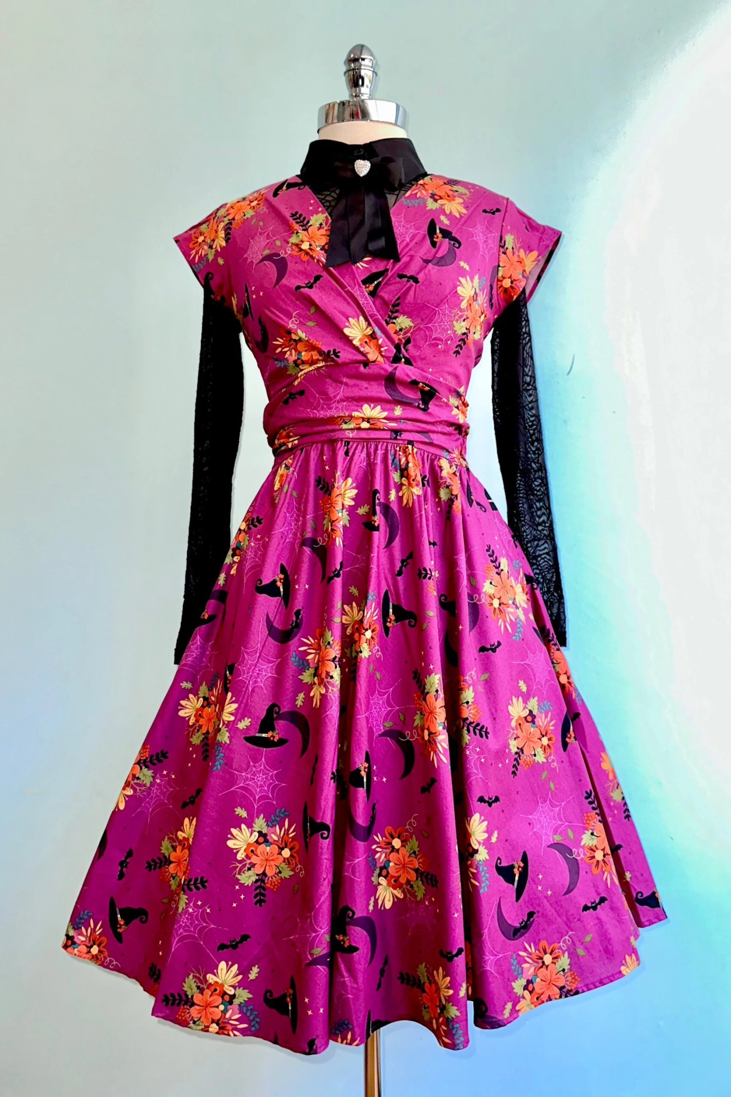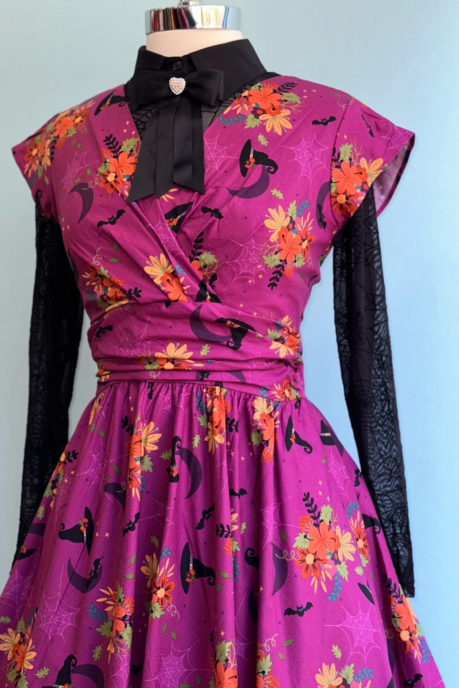 Woven mesh semi sheer summary down blouse in black with a spiderweb pattern throughout. This blouse has long sleeves and a summary front that finishes at the neck with a detachable bow.