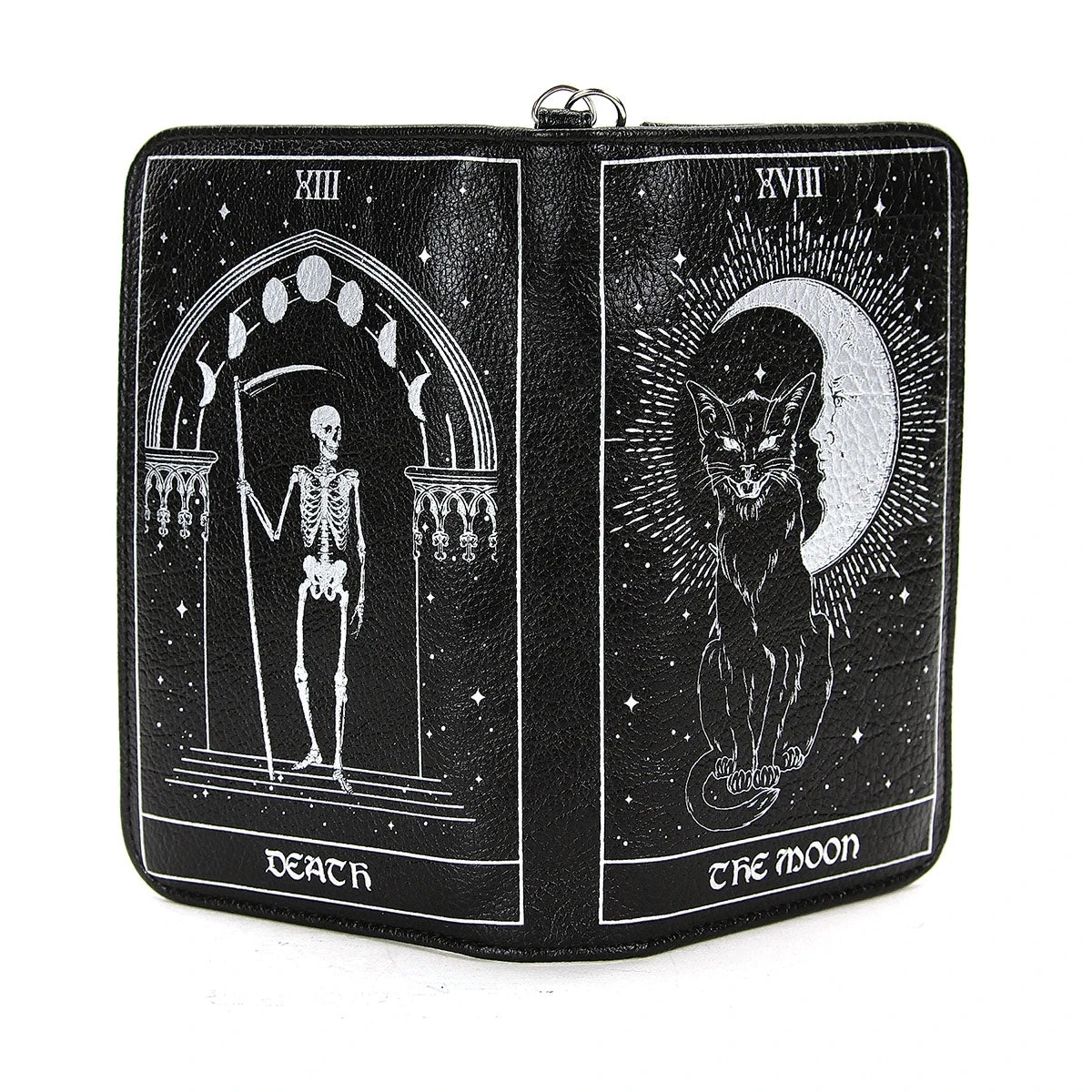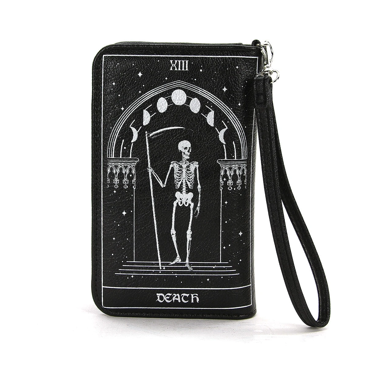 Vinyl wallet of Tarot Cards. The print is in white and is printed on the front and back. There is a snap closure and opens up to a cloth and vinyl lining. There are 10 card slots, a zip coin section and 2 open pockets. The wristlet strap measures 6″ and is removable.