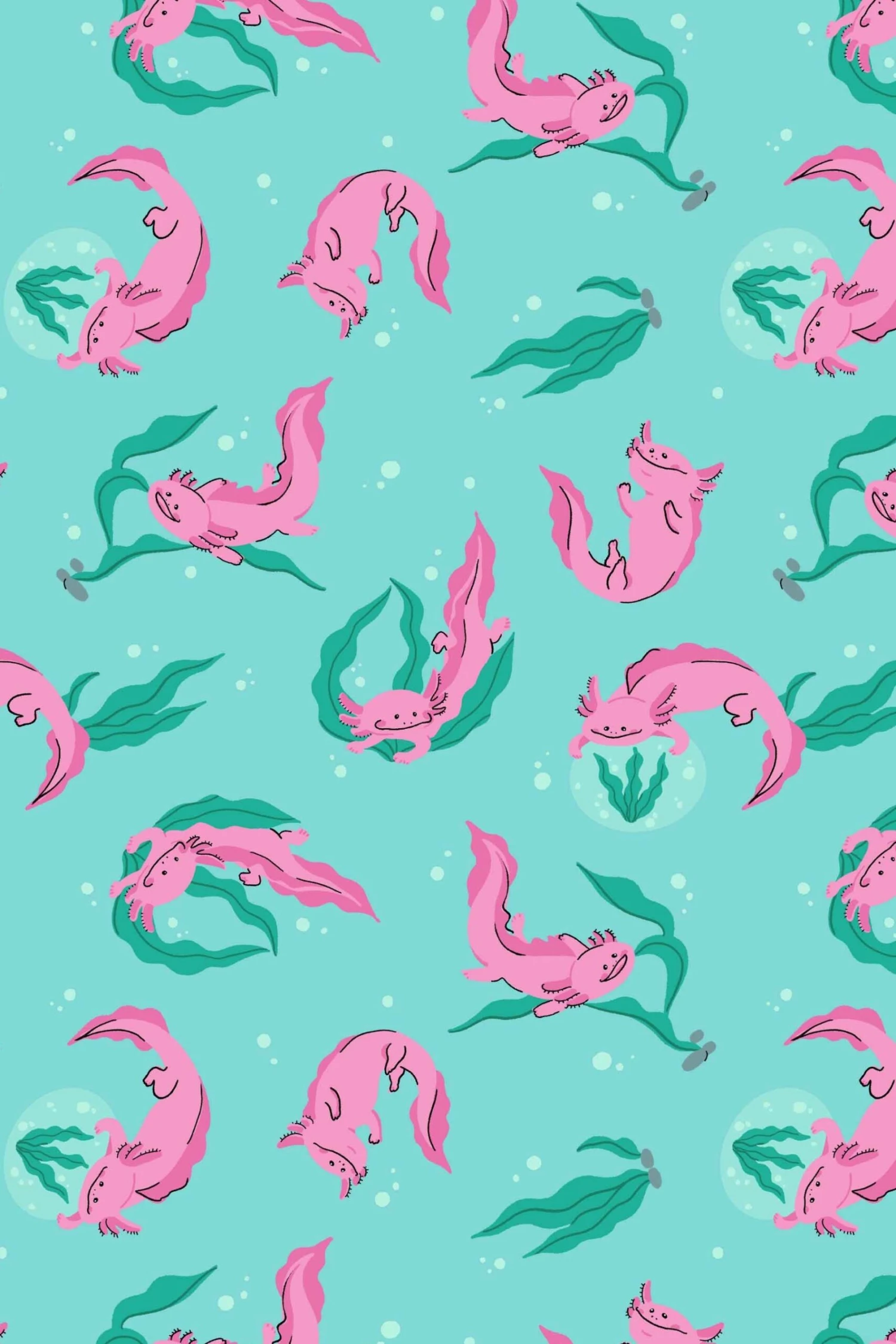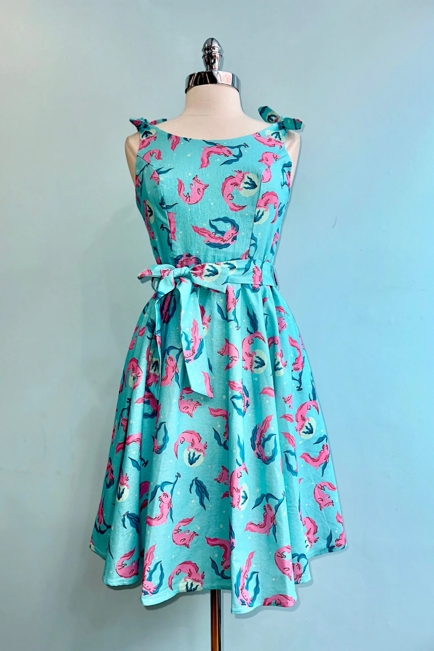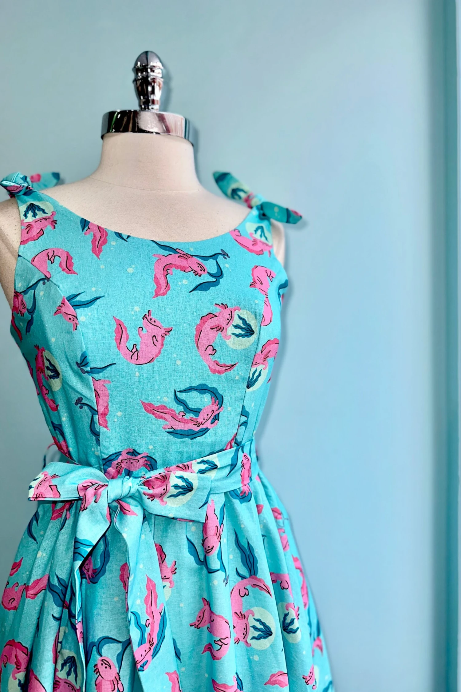 The Bri dress is a sleeveless dress with a scoop neckline and decorative bow-ties on fixed shoulder straps. The fabric is a woven linen in teal with pink axolotls and greens sea plants. This dress has a great fit! Zips up the back, is lined at the bodice, unlined skirt and has pockets! Original print artwork by Sweven Print Design.