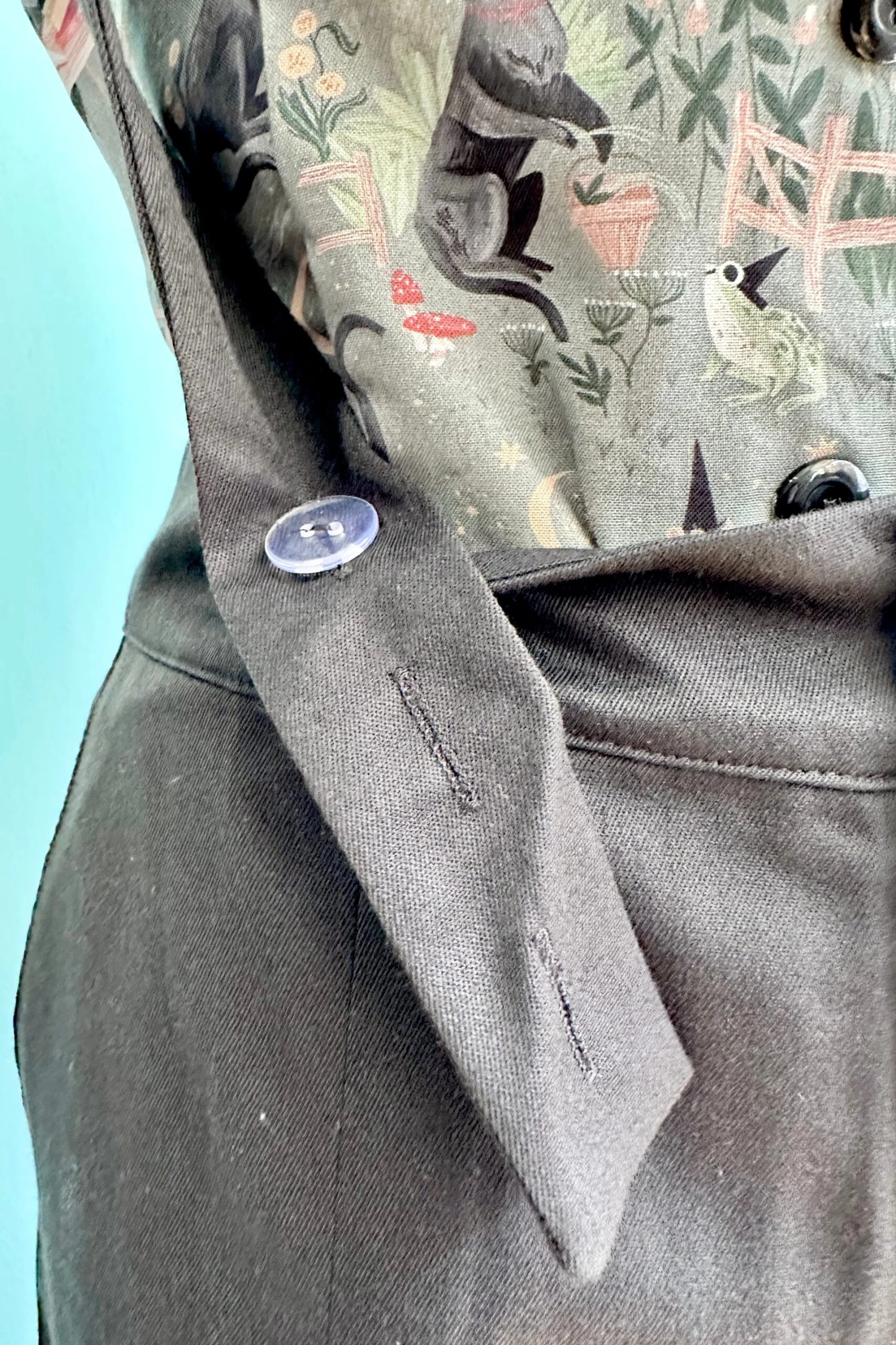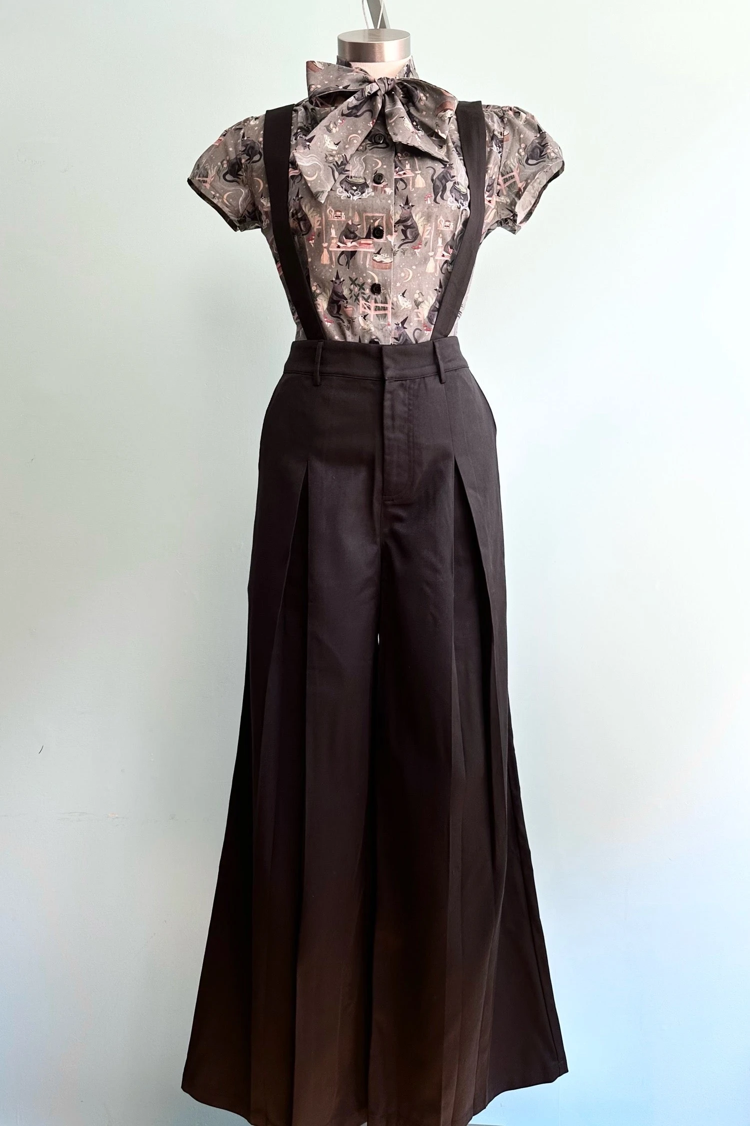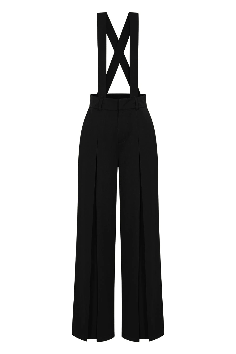 Black wide leg pants with removable and adjustable suspender straps. There is a pleat on each leg, a front zip for closure, and two side pockets.