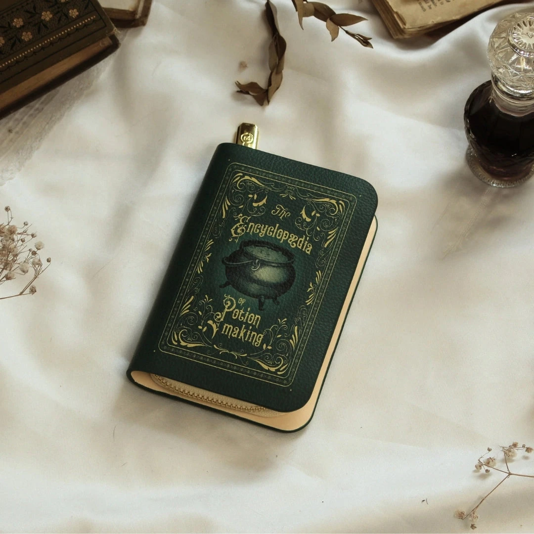 Embrace the enchantment of the mystical world with this stunning ‘The Encyclopedia of Potion Making’ vegan leather zip-around wallet purse. The front showcases ornate gold detailing on a dark green background, with a central illustration of a cauldron. This wallet purse perfectly captures the old-world, magical essence of potion making. The back features an illustration of a potion vessel bottle, adding to its apothecary allure. Whether you’re attending a magical gathering or simply going about your daily routine, this wallet purse is sure to infuse a touch of magic into your outfit.