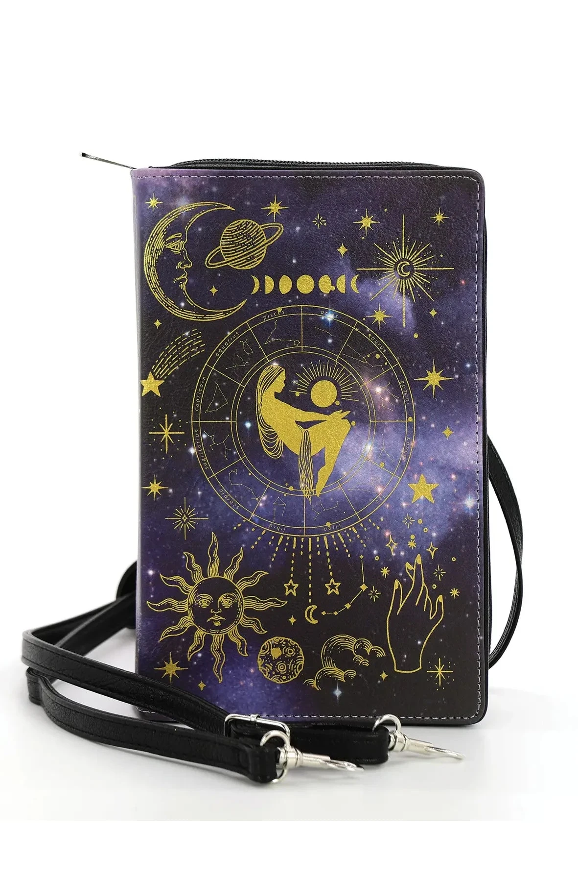 The Moon Child Cross-body Bag with a gold detail and a celestial backdrop. It has a zippered main closure and 3 divided compartments with a maximum strap drop of 25 inches.