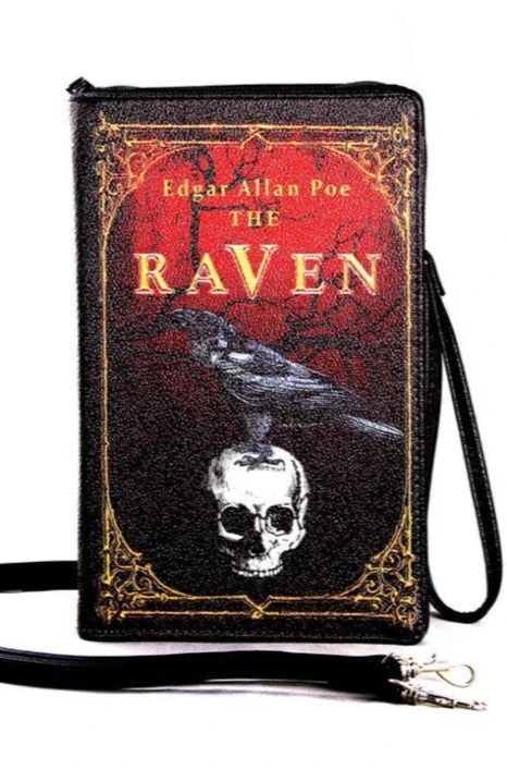 The Raven by Edgar Allen Poe Book Bag. This is made of black vinyl, with green, red and gold detail. This bag opens with a zips closure, comes with a wristlet and shoulder strap! Lined in fabric.