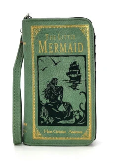 Vinyl wallet made to look like the book The Sleeping Beauty. The print is in gold and is printed on the front and back. There is a snap closure and opens up to a cloth and vinyl lining. There are 10 card slots, a zip coin section and 2 open pockets. The wristlet strap measures 6″ and is removable.