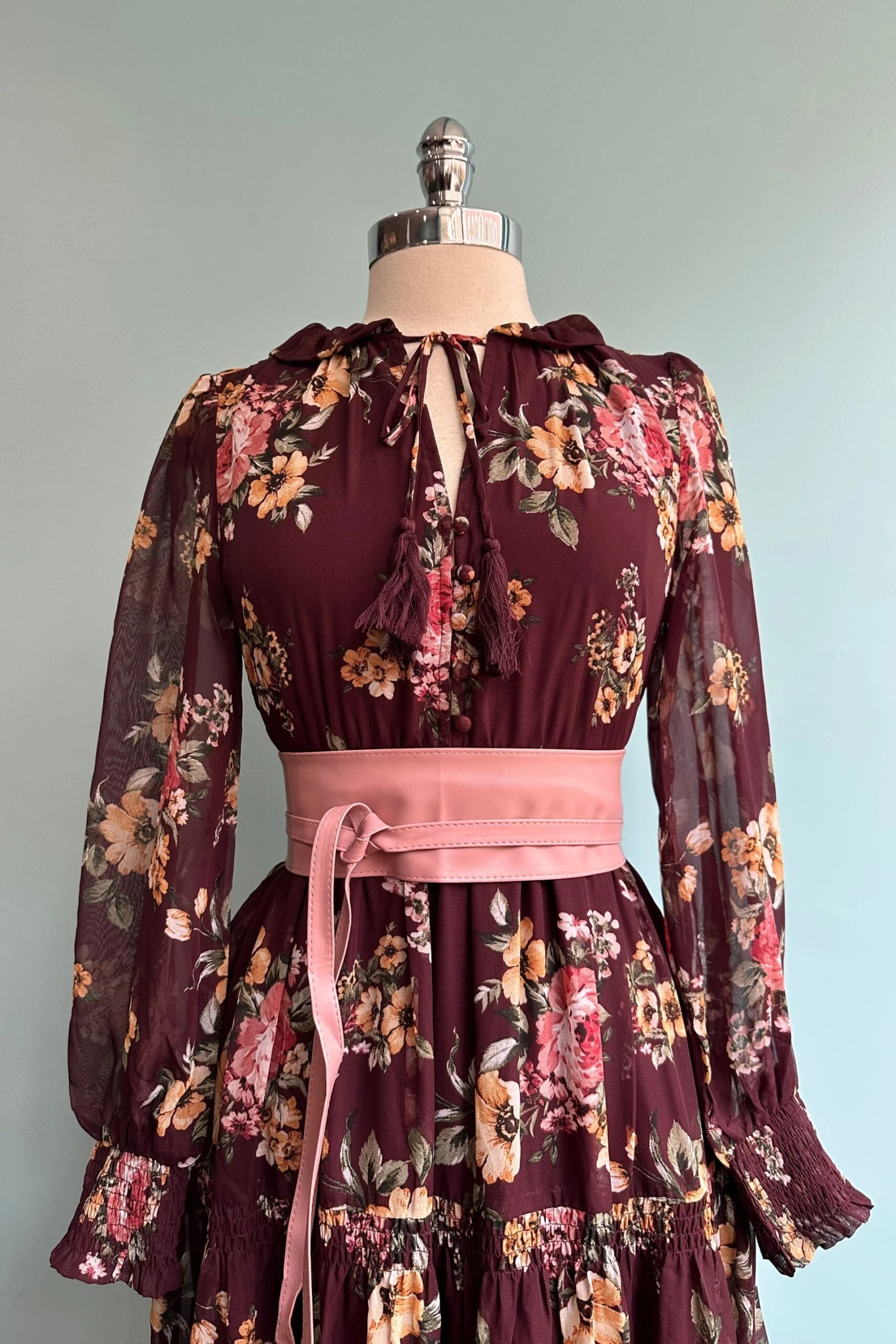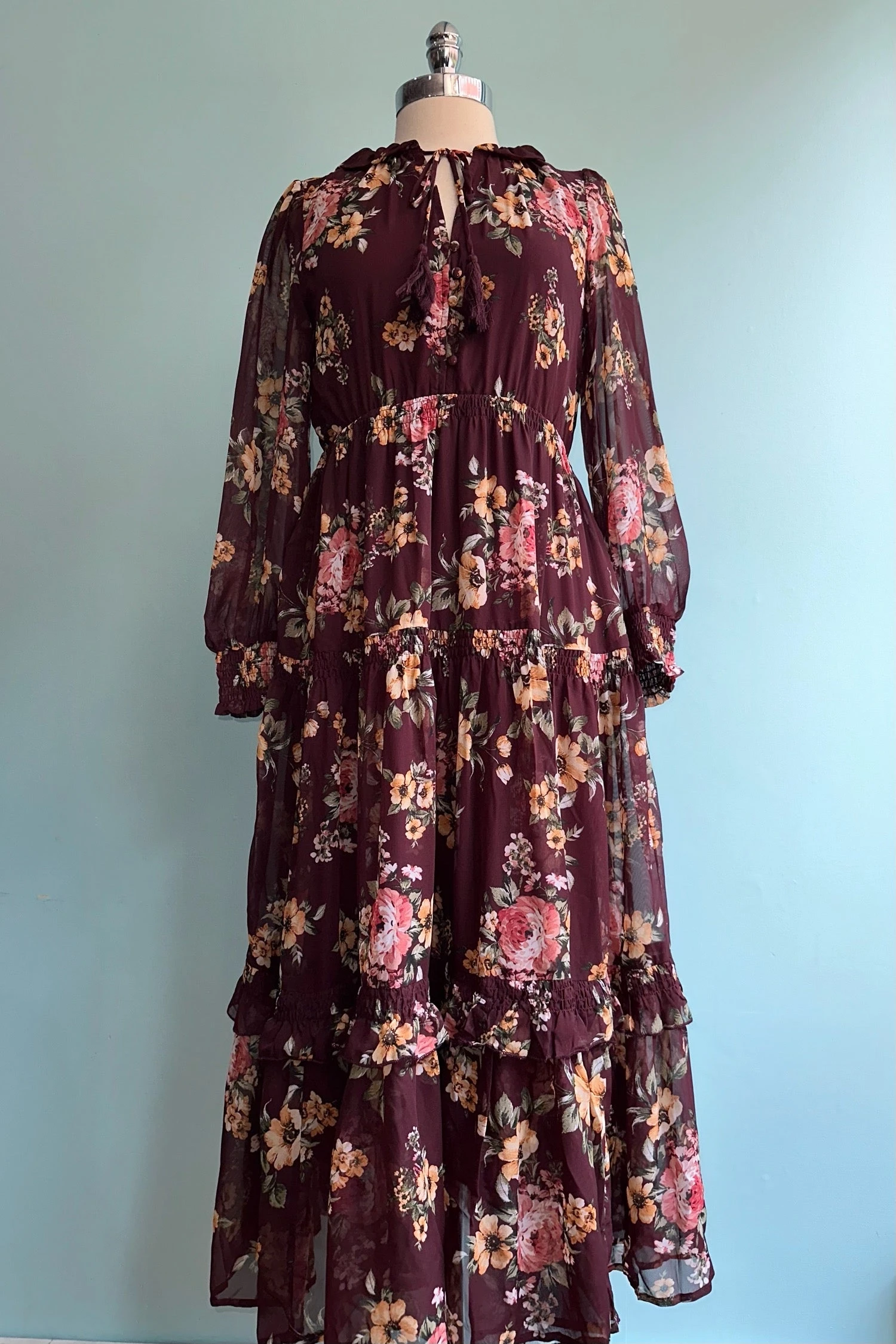 Long-sleeved burgundy maxi dress with a pink and tan floral print. The sleeves are balloon shaped and semi sheer and the neckline features a tasseled tie. This dress has an elasticized waist, the skirt is fully lined, and it has pockets. Functioning front summarys. Tie can be tied high at collar or low at the v-neck.
