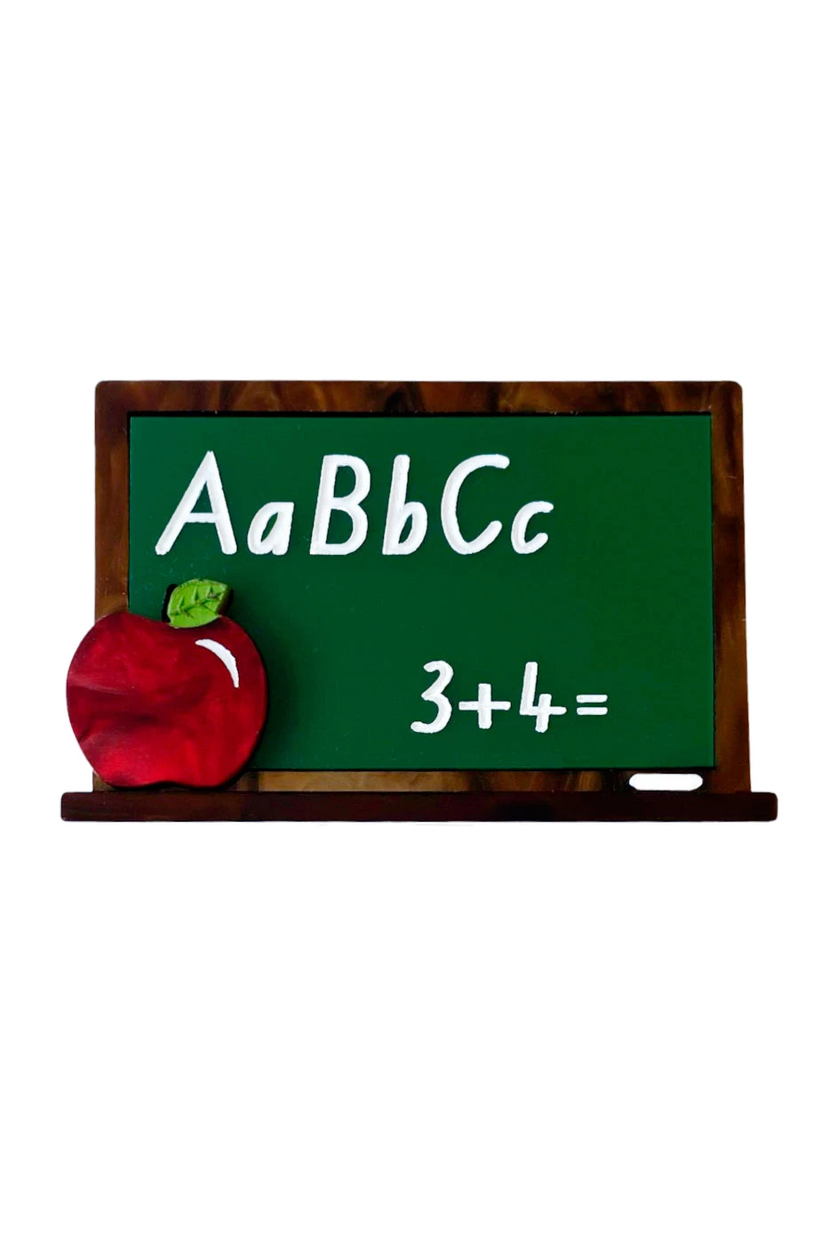 Chalkboard and apple teacher themed brooch by Daisy Jean. Made from acrylic with a stainless steel clasp. Designed in house, laser cut in and hand made in house at Daisy Jean HQ in Sydney Australia.
