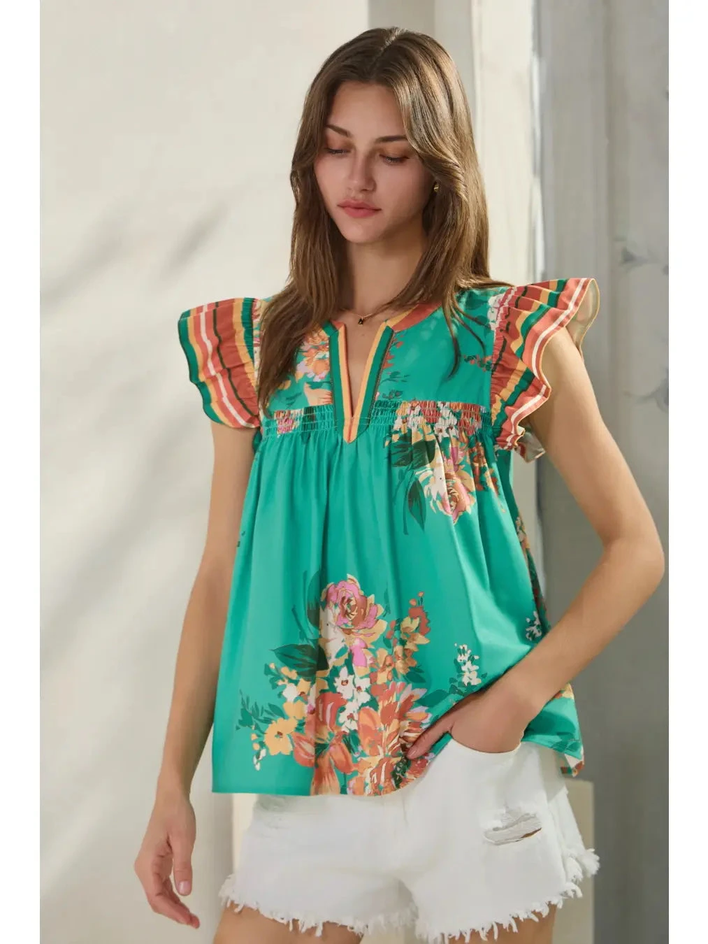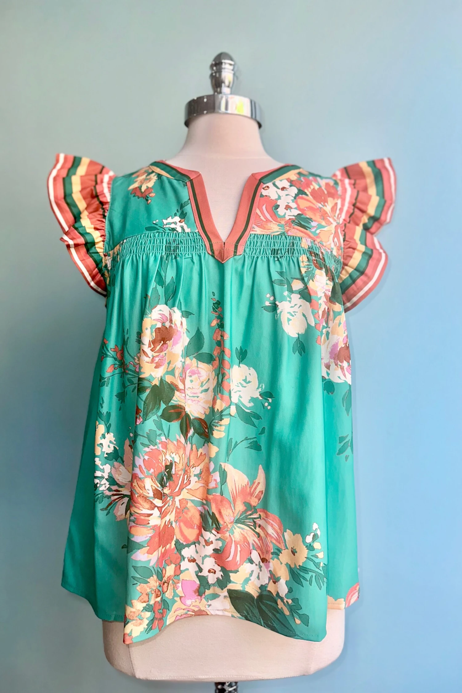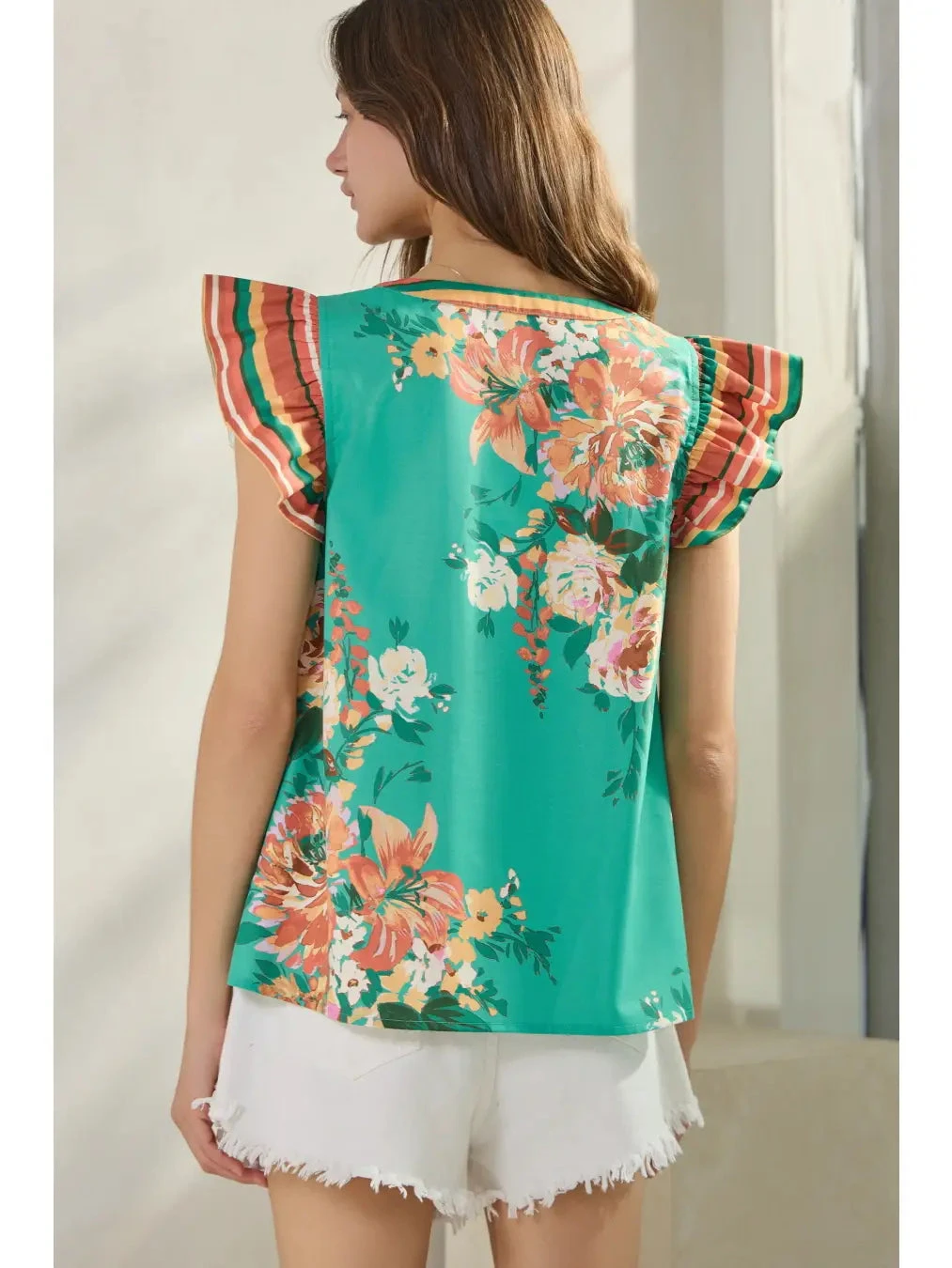 Turquoise green top with striped orange flutter sleeves. This is a V-neck style with a loose fit.