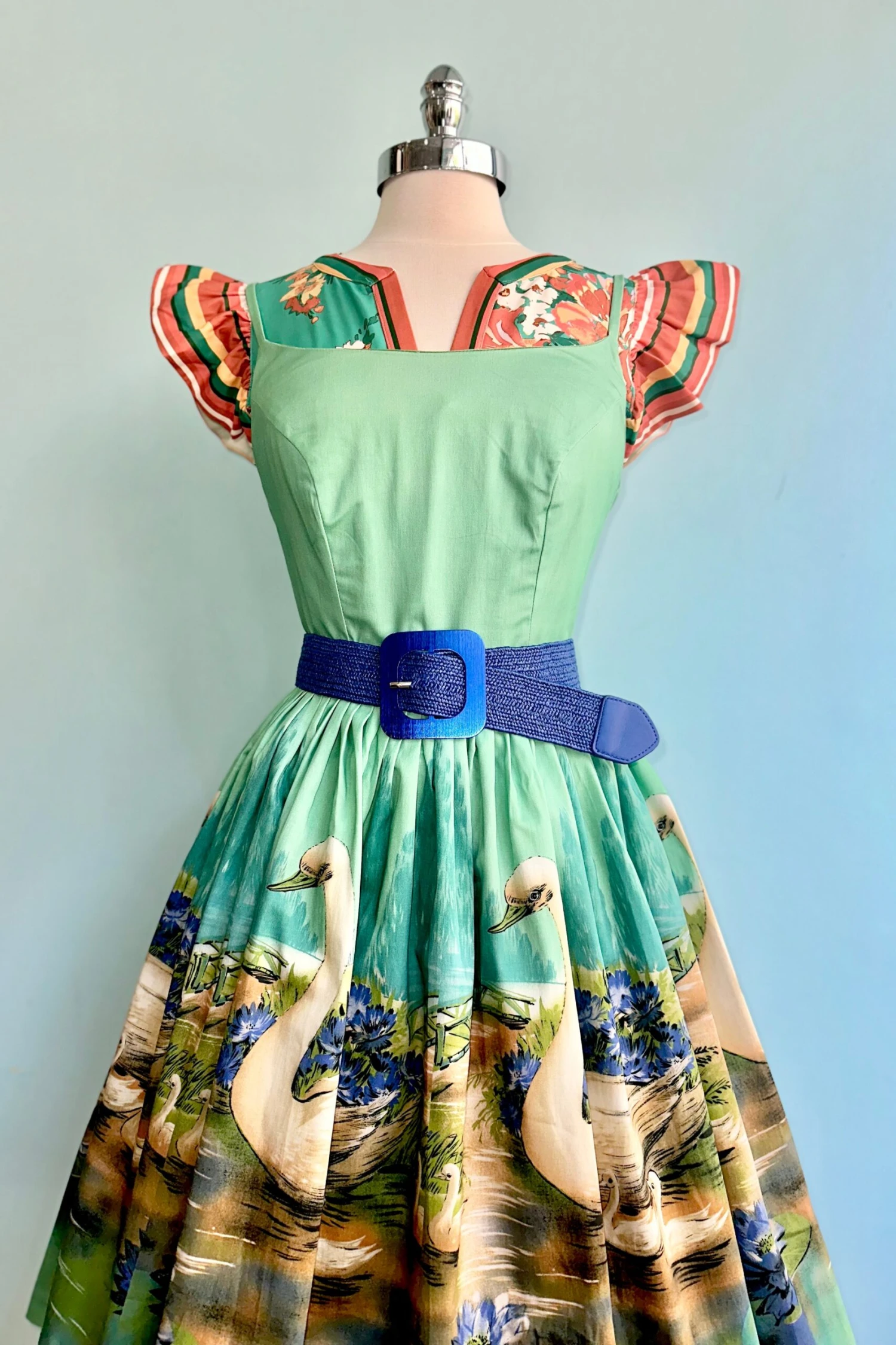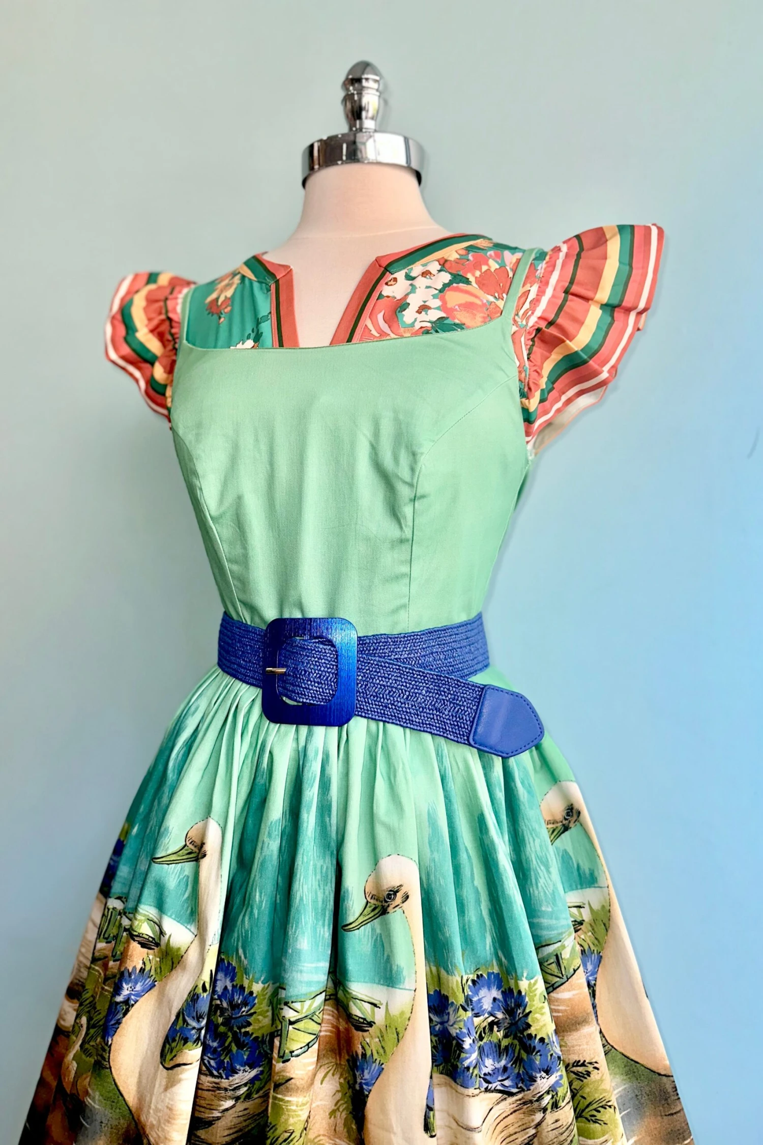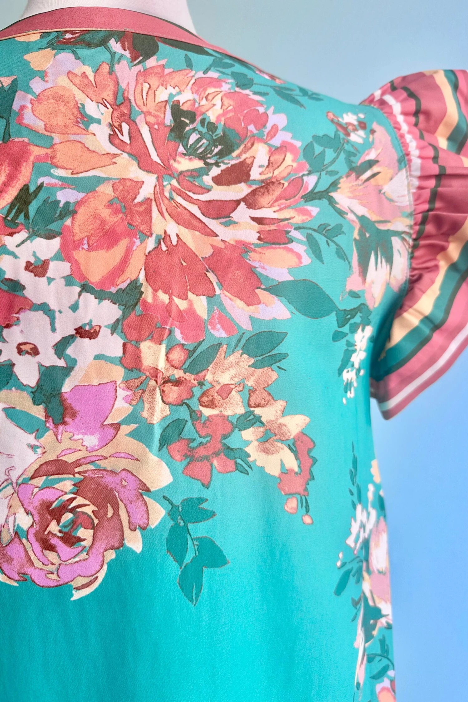 Turquoise green top with striped orange flutter sleeves. This is a V-neck style with a loose fit.