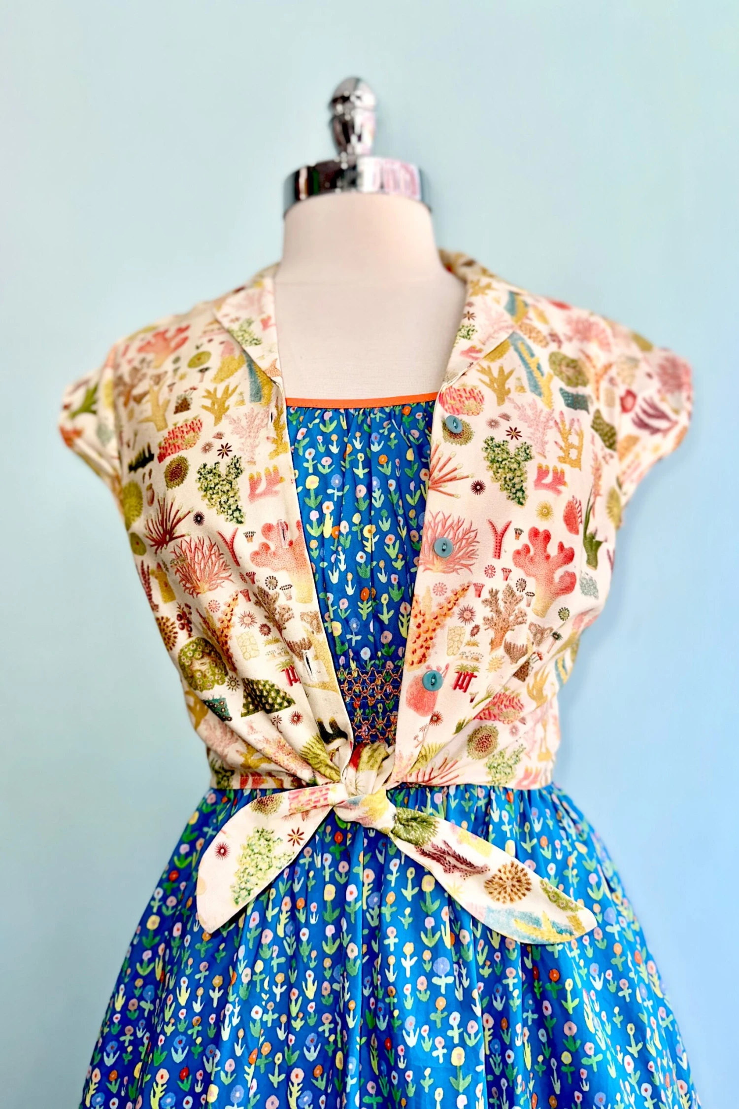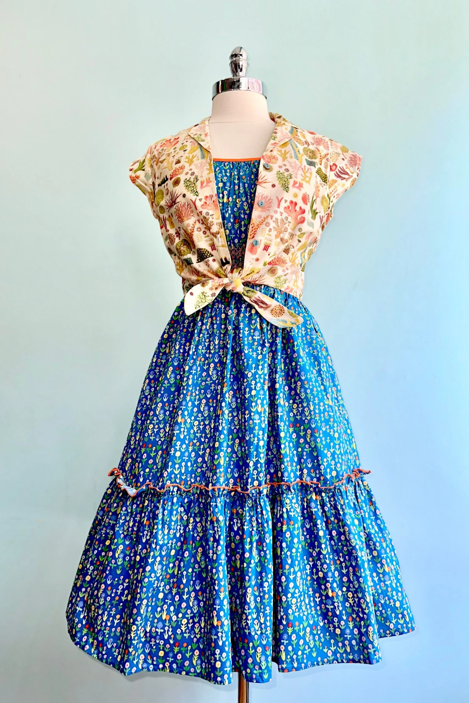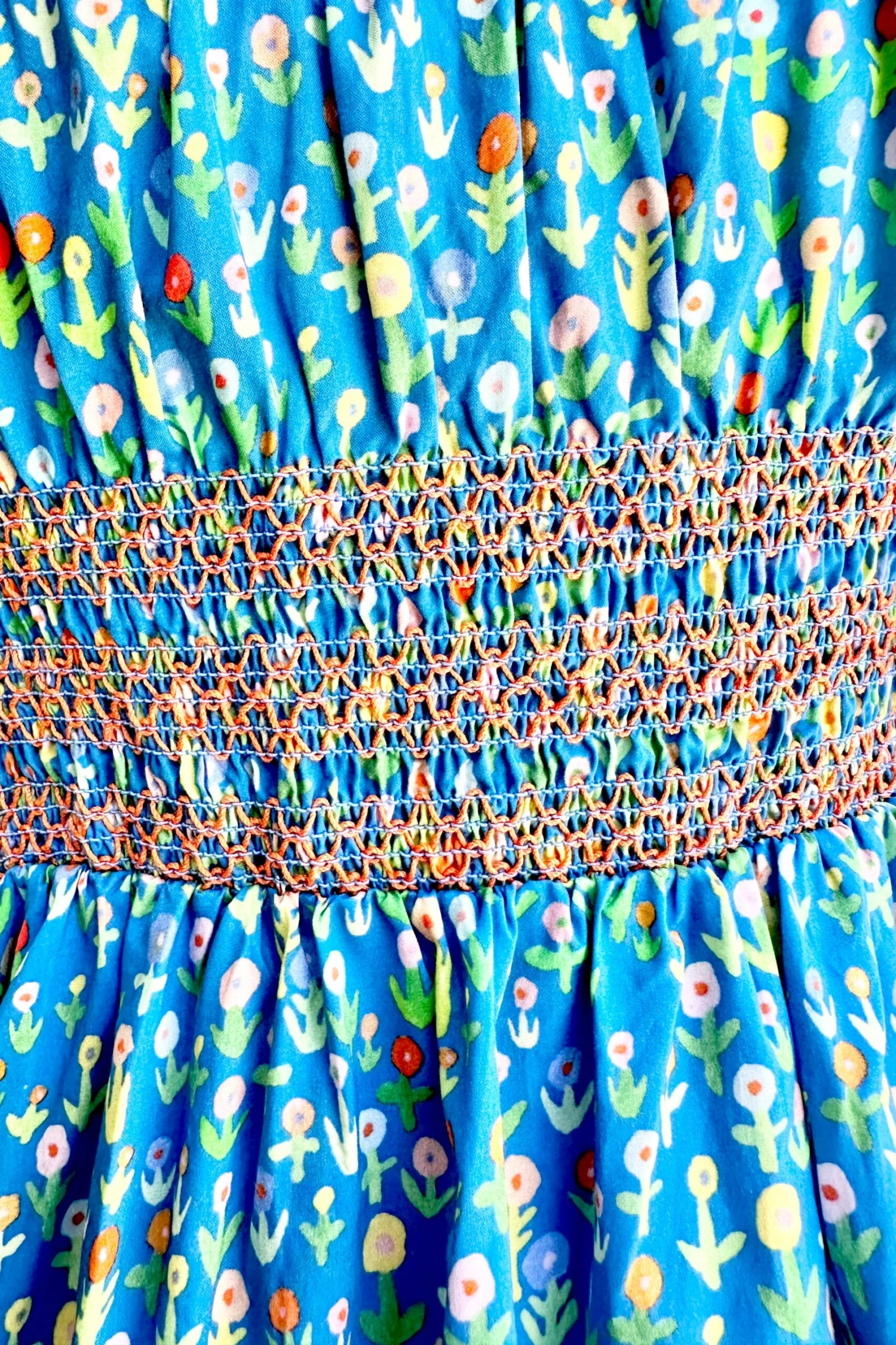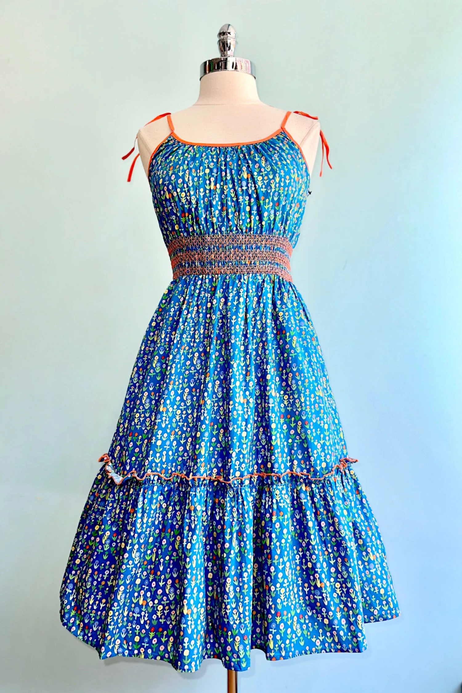 A multicolored floral dress in turquoise blue with a smocked waist. There are orange adjustable self-tie straps that coordinate with the smocked stitching.