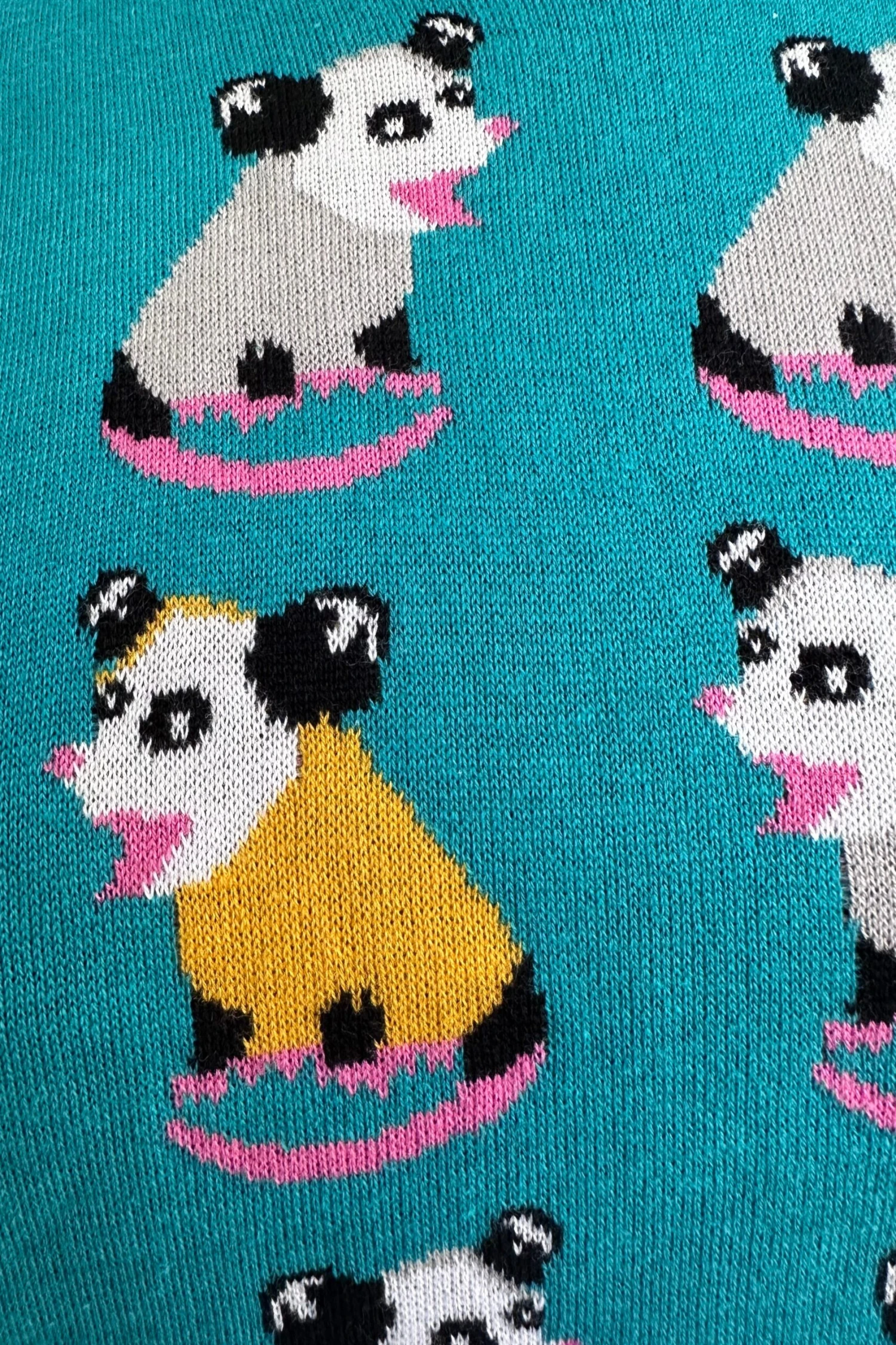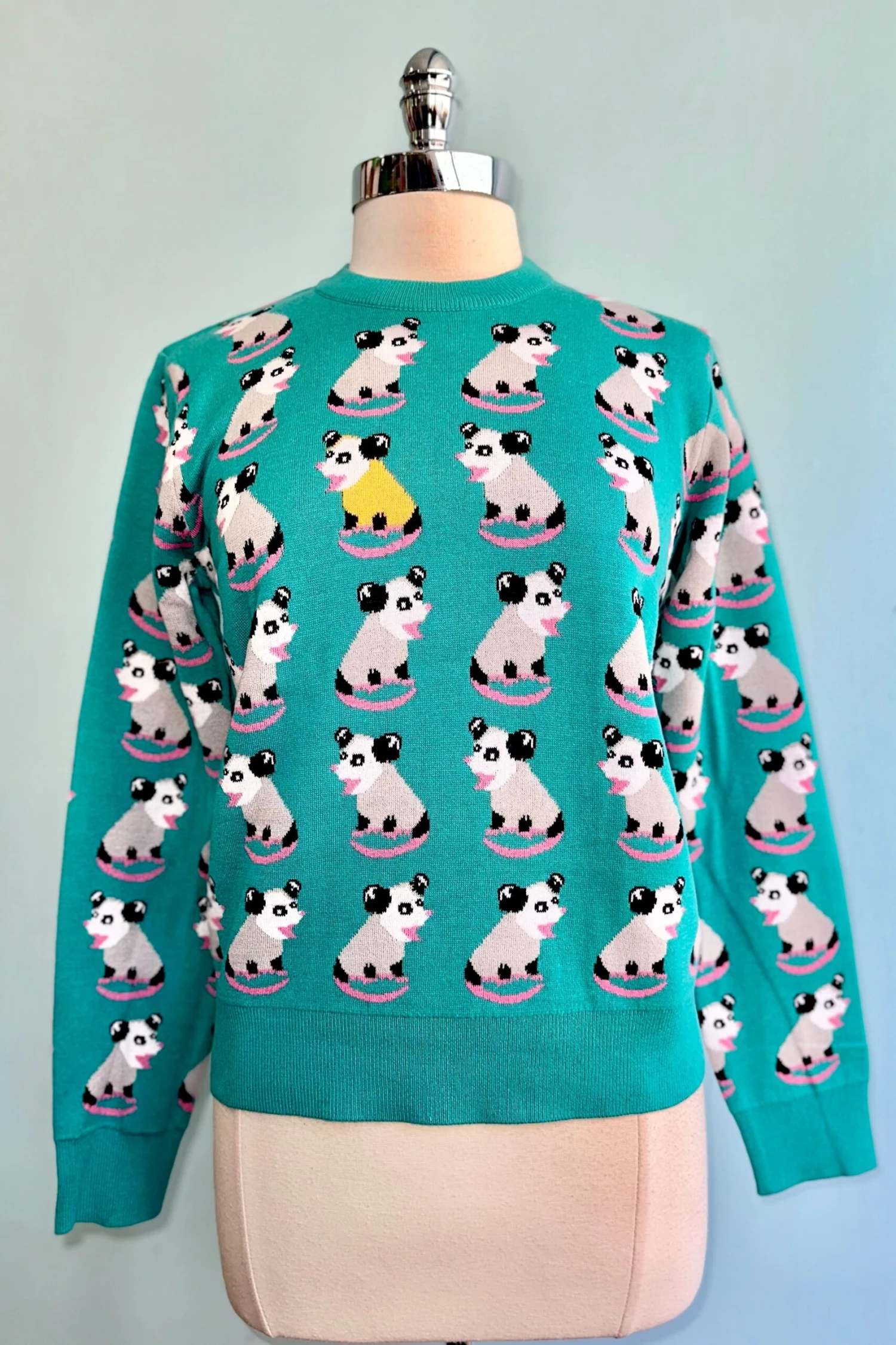 Amazing crew neck sweater of possums with gaping mouths against a turquoise background. The possums are all grey except one who is mustard!