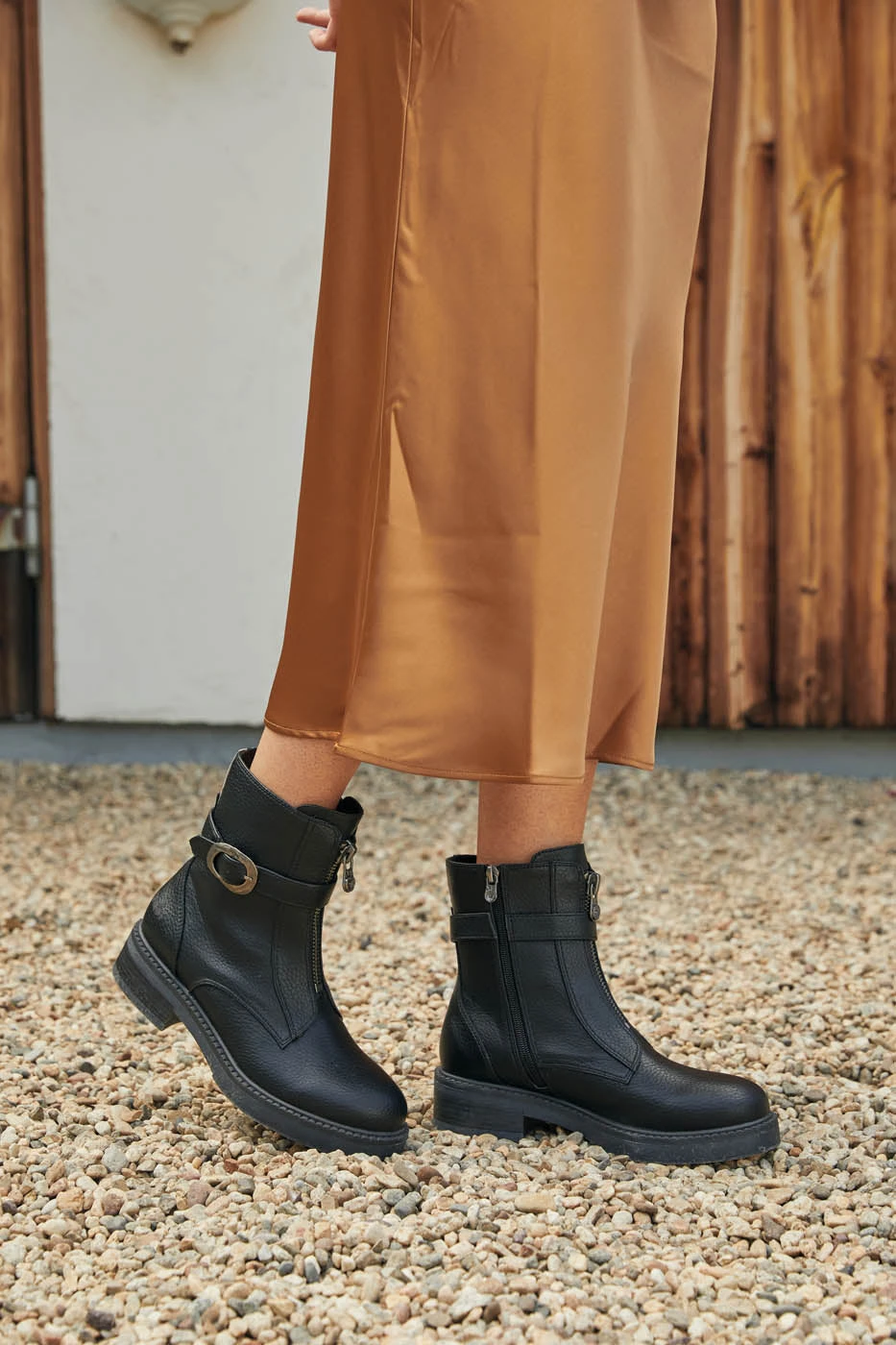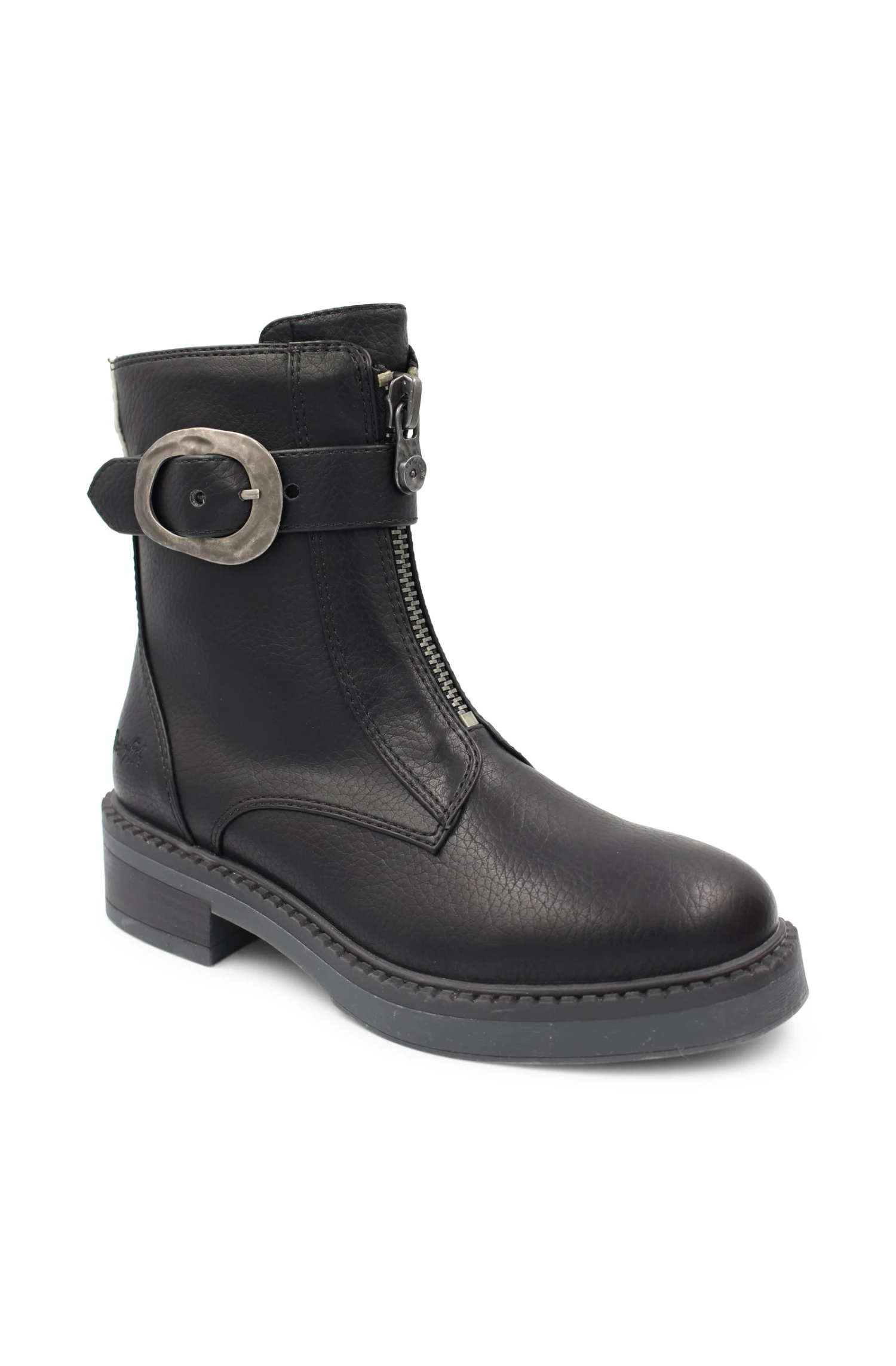 Black boots with zip front and buckle detail.