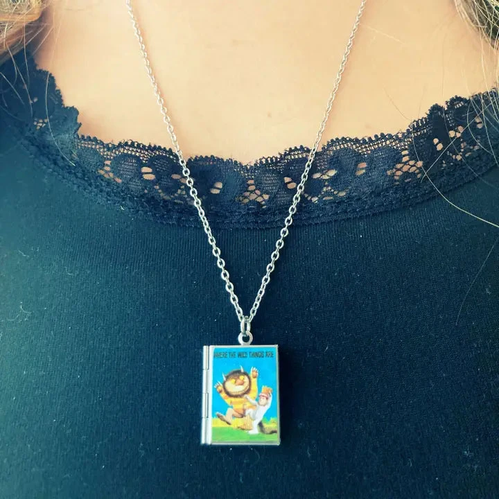 Book locket in Where the Wild Things Are! Our book lockets are made with nickel free materials and feature the most beloved classic and modern books! They are on 24-inch chains and are sealed with a gloss finish for durability. Each locket can hold two pictures.
