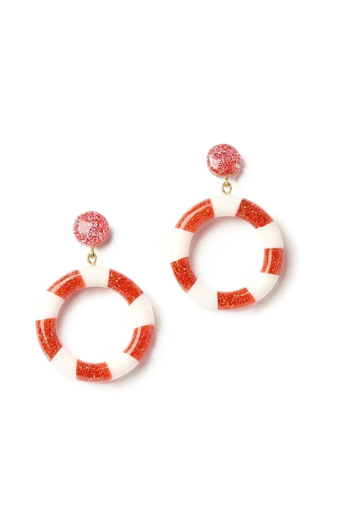 White and reddish pink striped candy cane earrings. These have a reddish pink glitter post with a dangle hoop.