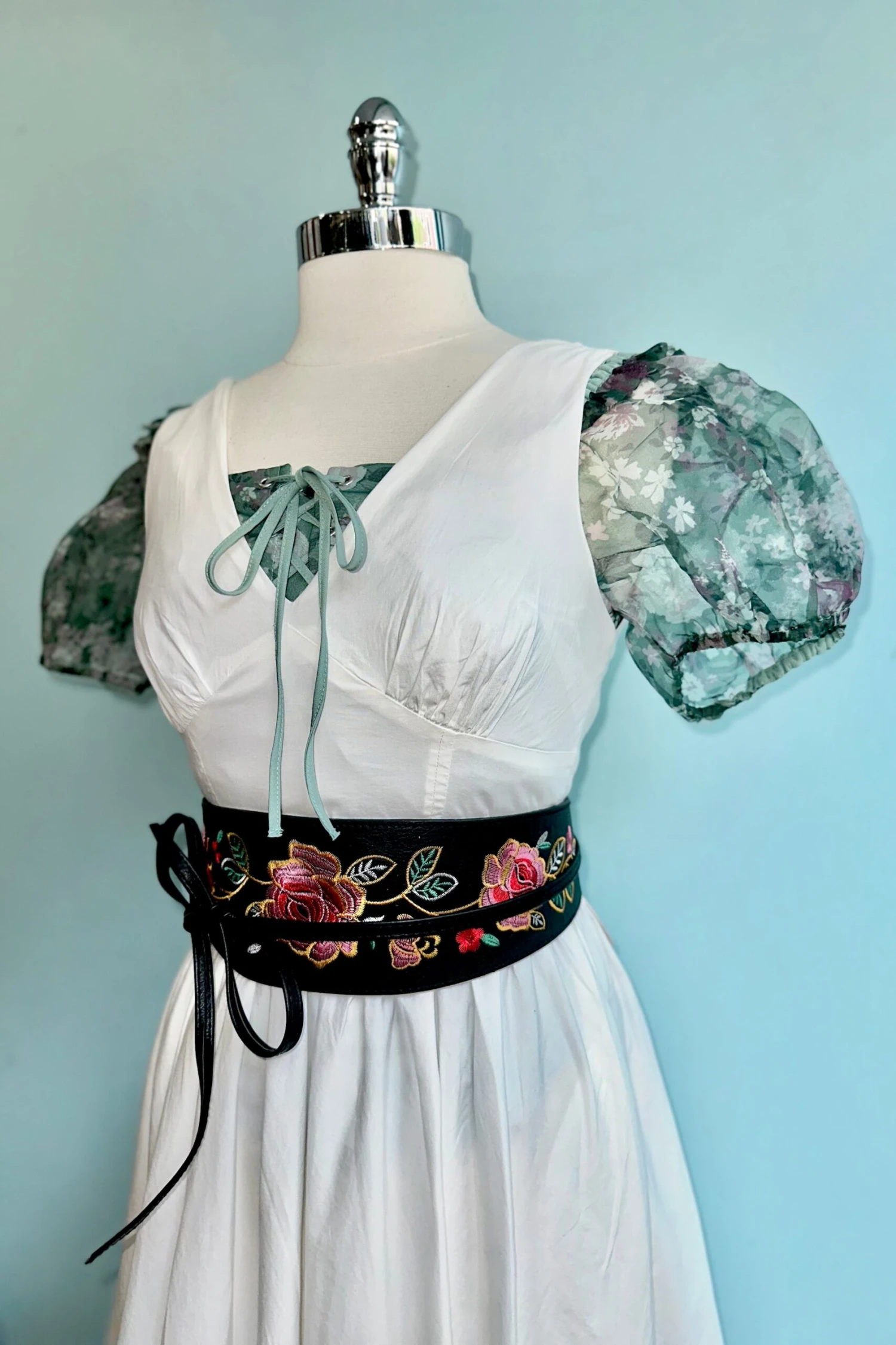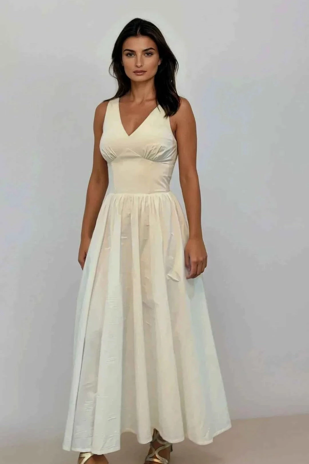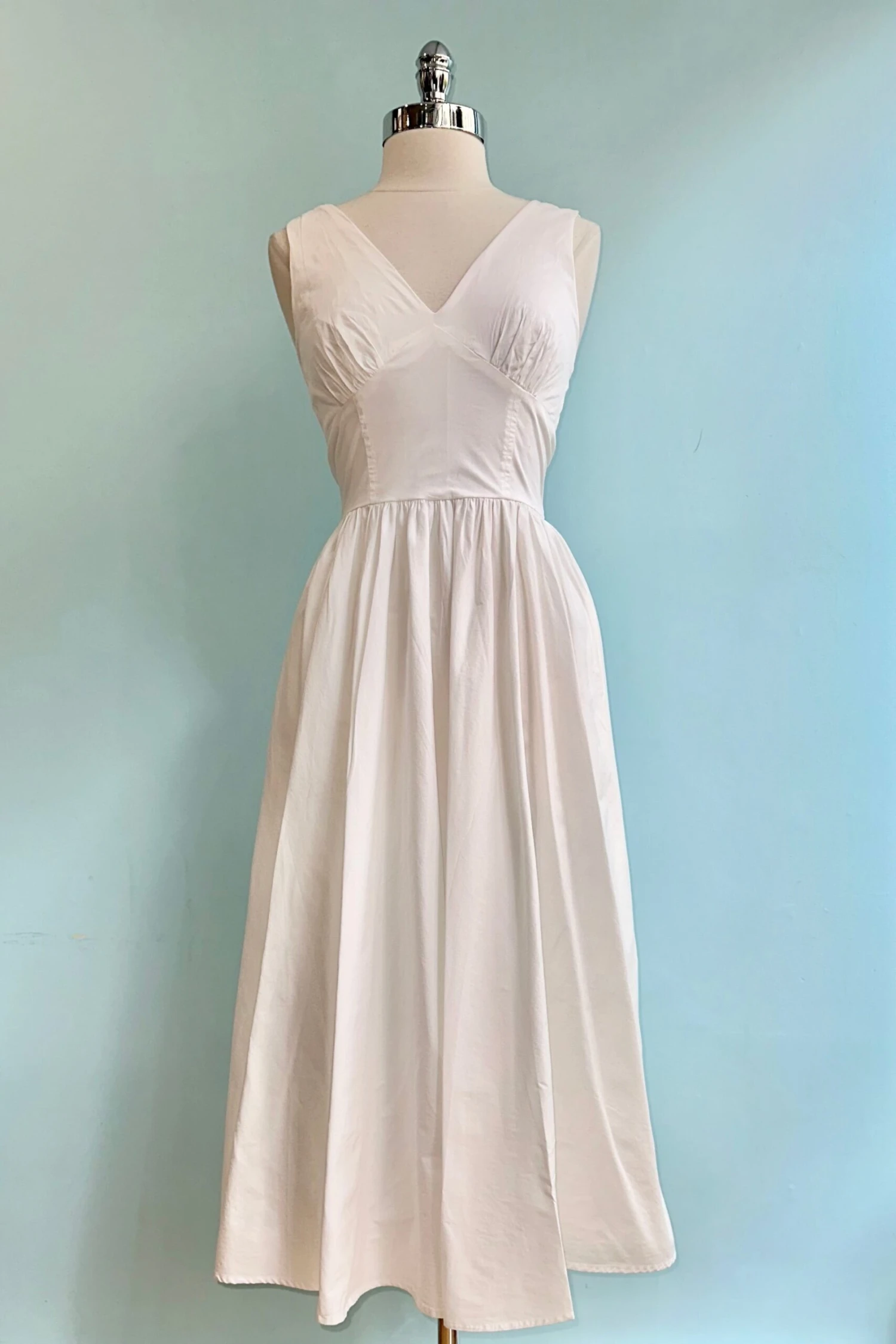 White V-Neck sundress with a smocked back and midi length skirt. This dress is made out of sustainable (BCI) stretch cotton poplin dress. Complete with pockets, this dress is perfect for weddings, garden parties, and vacations. There is a back zip for closure with a fully faced bodice.
