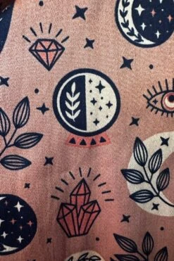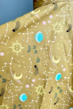 Clutch bag made of tapestry fabric in yellow with an embroidered print of a butterfly, leaves and moon. This bag has a kiss lock closure, comes with a metal chain strap in an antique brass and a short faux leather handle, and has an inside zippered pocket.