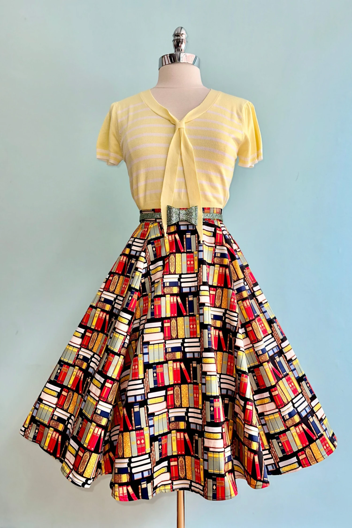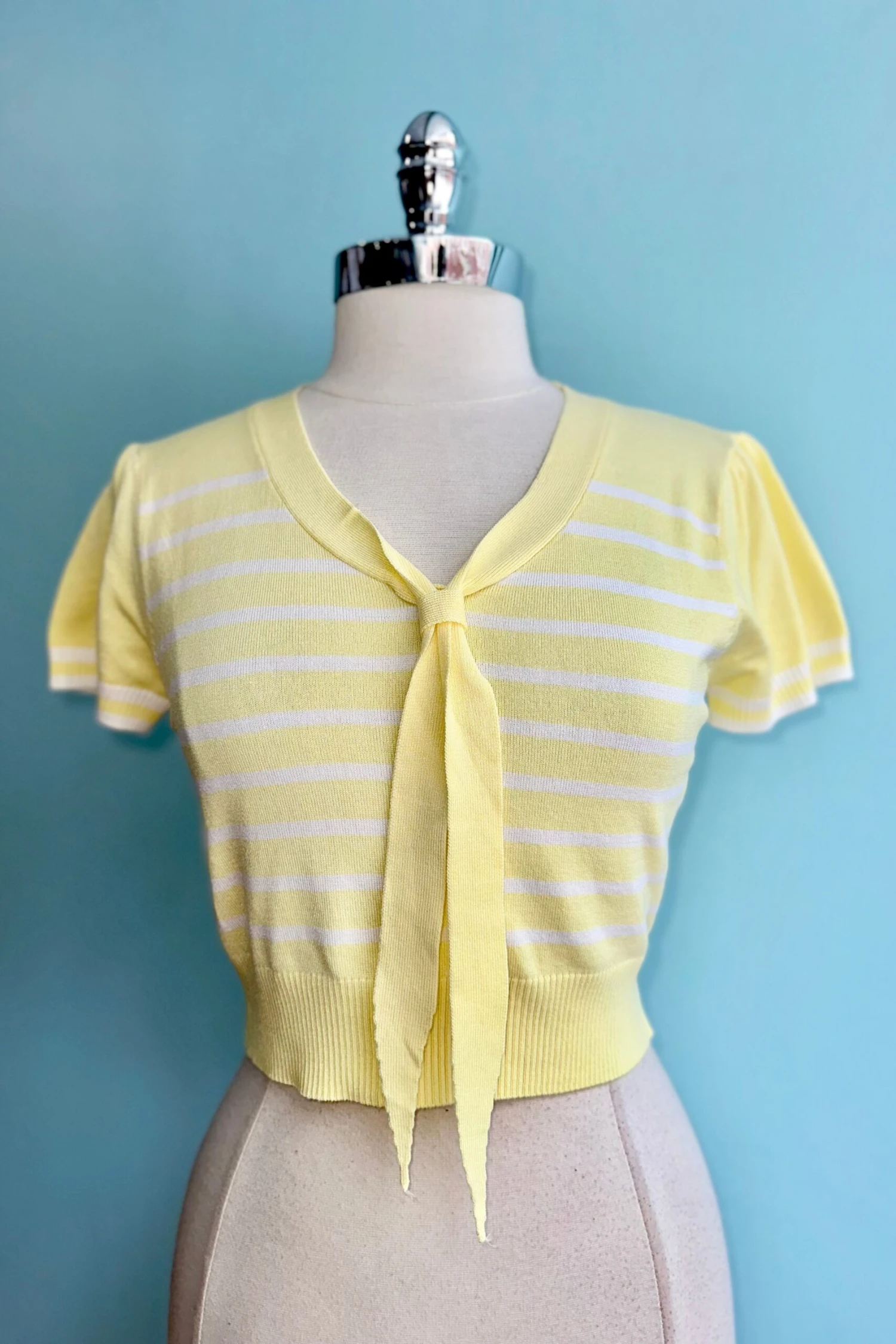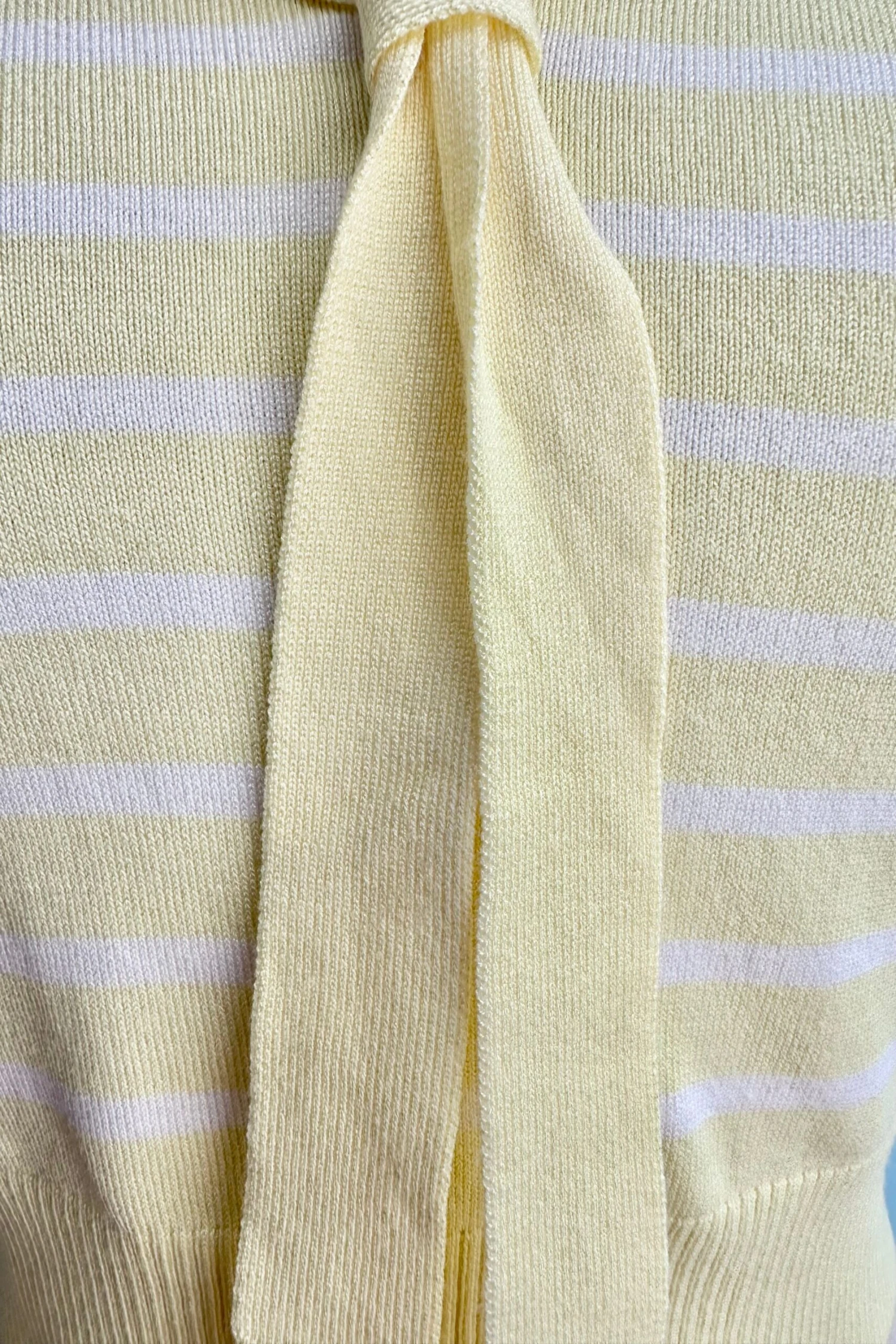 Yellow striped short sleeve sweater with a tie neck. This sweater has a cropped length and short puff sleeves.