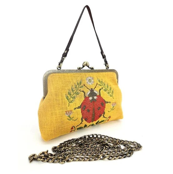 Clutch bag made of tapestry fabric in a yellow with a design of a ladybug, white flowers, and green leaves on one side. This bag has a kisslock closure, comes with a metal chain strap in an antique brass and a short faux leather handle, and has an inside zippered pocket.
